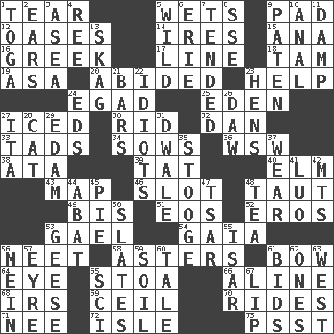 ACROSS 1. Pull into pieces 5. Soaks 9. Writing tablet 12. Fertile tracts in a desert 14. Angers 15. Santa ___, CA 16. Of Greece 17. Actor's bit 18. Scottish cap 19. White ___ sheet 20. Remained 23. Aid 24. Mild oath 25. Genesis locale 27. On the rocks 30. To free from 32. One of the 12 tribes of Israel 33. Small boys 34. Sty mamas 36. Compass dir. 38. _ moment's notice (2 wds.) 39. Make lace 40. Shade tree 43. Atlas unit 46. Slit 48. Strained 49. Twice 51. Greek goddess of the dawn 52. Greek god of love 53. Highlander 54. Greek goddess of the earth (variant) 56. Confront 58. Michaelmas daisies 61. Arrow shooter 64. Sight organ 65. Portico 66. Place in a line 68. Big collection agency 69. To provide with a ceiling 70. Amusement-park features 71. Born 72. Small island 73. Inconspicuous attention getter DOWN 1. Ancient Roman robe 2. Hearing organs 3. Toward the sea 4. To riddle 5. Rampant 6. One of the Great Lakes 7. Watched over 8. Compass dir. 9. Eucharist need 10. Of or related to the anus 11. Moist 13. Heroin 21. Taverns 22. Foolish or stupid persons 23. Coop moms 24. Begley and Asner 26. Simpleton 27. Call ___ day 28. Domesticated feline 29. Dutch treat 31. A sleeping potion; an opiate (poet.) 35. Moe Howard, for one 37. Put on (as clothing) 41. Nilotic language 42. Mountains (abbr.) 44. Blind as ____ 45. Sliced dessert 47. Russian ruler of old 48. Beverage made from leaves 50. Chalkboards 53. Honkers 55. Austrian river, tributary to the Danube 56. Chow _ 57. Jane of fiction 59. Land 60. Lie 61. Auction offers 62. Singles 63. Compass direction 65. _-fi 67. Mouth edge