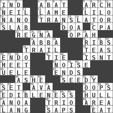 ACROSS 1. Working for oneself (abbr.) 4. Blind as ____ 8. Bowlike part 12. Famous astronaut Armstrong 14. Unable to walk 15. _ and Stitch 16. Billionth: prefix 17. Interpreter 20. Broad, flat, thick piece 21. ___ good deed 22. Tax preparer (abbr.) 23. Canadian anthropologist Darnell 27. Brightly colored fish 29. Swedish rock group 31. Teases 34. Hang back 35. Beverages made from leaves 36. Inside; within (prefix) 39. Neckwear 41. Is not 42. Confront 43. Annoying sound 46. Ubangi River tributary 47. Conclusions 48. American tennis player Robert 51. Morally degraded 54. Put into a specified state 56. Actress Gardner 58. I made a mistake 61. The property of being fit to eat 66. Frame or body of a ship 67. Small Philippine buffalo 68. Musical group of three 69. Length times width 70. Austrian-born American filmmaker Fritz 71. Plant excrements 72. Erode DOWN 1. Restaurants 2. Anneal 3. Middle Eastern gold or silver currency 4. Keyboard modifier key 5. Long, evenly shaped piece 6. Wet nurse (var.) 7. Be inclined (to) 8. In the manner of 9. Actors Guy, Robert Welles, and Clint 10. Hoof sound 11. Israeli folk dance 13. Ear part 18. "Barney Miller" actor Jack 19. Pet locale 24. Slender fish 25. Basketball assoc. 26. "This won't hurt ____!" 28. Nick name for Arthur 30. Place in a line 32. Forbid 33. Fast jet (abbr.) 34. Lugs 36. Australian flightless bird 37. Born 38. Accusation by an informer 40. Immeasurably long periods of time 44. Binary compound 45. Compass dir. 49. Actor Linden 50. Night before a holiday 52. Capital of the state of Qatar 53. You are 54. Lick closed 55. Pulitzer Prize-winning author Ferber 57. Pismires 59. Entreaty 60. Narrow board 62. Container for groceries 63. Epoch 64. Small drink 65. Distress signal