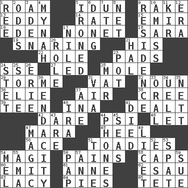 ACROSS 1. Wander 5. Goddess of spring and wife of Bragi 9. Immoral or dissolute person 13. Whirlpool 14. Pace 15. Arab leader 16. Paradise 17. Music written for nine 18. "Two Mules for Sister ____" 19. Catching in a trap 21. Part of HMS, perhaps 22. Opening into or through something 23. Writing tablets 24. Compass dir. 27. Directed 28. Undercover agent 29. Singer Mel 31. Large container 32. Part of speech 36. Writer Wiesel 37. Atmosphere 38. Algonquian 39. Adolescent 40. _ tizzy (2 wds.) 41. Started a card game 42. Have the gumption 44. Air pressure measure (abbr.) 46. Allow 47. Hindu Mythology: god of death 48. Person who is morally reprehensible 50. Adept person 51. Sycophants 54. Wise men 56. Aches 58. Balmoral and tarboosh 60. Give off 61. Singer Murray 62. Son of Isaac 63. Made of lace 64. Sliced desserts 65. False hair DOWN 1. To riddle 2. Probability 3. Arabian gulf 4. Non-adult bird? 5. Pressed 6. Mild oath, euphamism for damn 7. Shoshoni 8. Fish or hair follower 9. Dwelling 10. Collect or gather 11. Apertif with cassis 12. Period 17. "Death on the ____" 20. Hero or heavy, e.g. 21. Actor Linden 23. Cooking vessel 24. Proofreading order 25. Not divided or shared with others 26. One of the Great Lakes 28. Third mo. 30. Ananias' fault 31. By way of 33. Spoken 34. Ubangi River tributary 35. Remaining after all deductions 37. A saturated hydrocarbon 40. Retirement account (abbr.) 41. Passed on 43. "We ___ not amused" (Victoria) 44. Gives a jingle 45. Oceans 47. Mysterious quality of enchantment 49. It is permitted: Lat. 51. Prong on a fork 52. Relaxation 53. Argument over a trivial matter 54. Cartoonist voice _ Blanc 55. Nursemaid (var.) 56. Infant food 57. Cuckoo 59. Institute legal proceedings