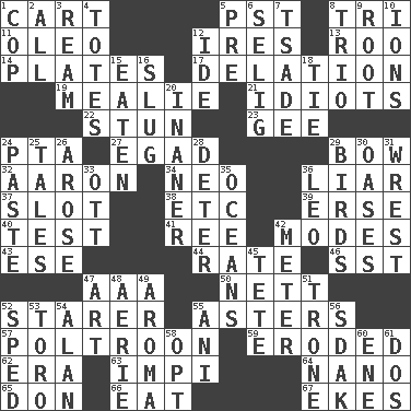 ACROSS 1. Haul 5. Pacific Standard Time (abbr.) 8. Three (prefix) 11. Margarine 12. Angers 13. Friend of Pooh 14. Food holders 17. Accusation by an informer 19. Ear of corn 21. Foolish or stupid persons 22. Surprise greatly 23. Turn to the right 24. Parent Teacher Association (abbr.) 27. Mild oath 29. Ribbon knot 32. Composer Copland 34. Modern: prefix 36. One who doesn't tell the truth 37. Position in a hierarchy or organization 38. And so on (abbr.) 39. Celtic language 40. Trial 41. Portuguese money of account (variant) 42. Methods 43. Compass dir. 44. Pace 46. Fast jet (abbr.) 47. American Automobile Association (abbr.) 50. Remaining after all deductions 52. A viewer who gazes fixedly 55. Michaelmas daisies 57. Coward 59. Worn away 62. Epoch 63. Body of Kaffir warriors 64. Billionth: prefix 65. Spanish title 66. Erode 67. Makes supply last DOWN 1. Police officer (slang) 2. Everything 3. 480, 500 or 516 sheets of paper 4. Lugs 5. Before (prefix) 6. Former Milwaukee Brewers owner Bud 7. Sadhe (variant) 8. Musical group of three 9. Carrot, for example 10. Charged atoms 12. Binary compound 15. Ingested 16. A hard, heavy blow 18. Make a knot 20. Sillier 24. Thick mixture 25. Stories 26. Came up 28. Prevent from occurring 29. Avian creatures 30. Fertile tracts in a desert 31. Obtain by seizing forcibly or violently 33. Baseball player Mel 35. Seas 36. Lion 42. Distance measurement 45. False hair 47. Tate display 48. Nest on high 49. Odor 51. Marketplace scale 52. Hurried 53. "Corrida" creature 54. ____ Jay Lerner 55. Black tropical American cuckoo 56. Neighbor of Neb. 58. Elect 60. Compass dir. 61. Two (Sp.)