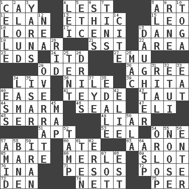ACROSS 1. Island 4. For fear that 8. Tate display 11. Liveliness 13. Value system 15. Lion 16. Old wives' tales, e.g. 17. Ancient Celtic tribe of eastern Britain 18. Mild oath, euphamism for damn 19. Type of eclipse 21. Fast jet (abbr.) 22. Type of rug 23. Begley and Asner 24. It would 27. Australian flightless bird 29. River in Europe 30. Match 34. 54 in ancient Rome 36. The longest river in the world 39. Riviera of "Kiss of the Spider Woman" 40. Comfort 41. Miss Universe 1986, Barbara Palacios _ 43. Strained 44. Excessive but superficial compliments 46. Lick closed 47. Biblical high priest 48. Father Junipero _ 49. One who doesn't tell the truth 51. Fitting 53. Snakelike fish 54. Single 57. "This won't hurt ____!" 60. Had dinner 63. Composer Copland 65. Female horse 66. Haggard of country music 69. Narrow, elongated depression 70. _ tizzy (2 wds.) 71. Mexican monetary units 72. Introduce or present, as a question 73. Lair 74. Remaining after all deductions 75. For each DOWN 1. Cell (Danish) 2. Verbally 3. Entertaining tales 4. Flowery wreath 5. And so on (abbr.) 6. "______ My Girl" (Turtles hit) 7. Metal containers 8. Having or resembling wings 9. French philosopher Descartes 10. Ancient Roman robe 12. Teachers' org. 14. Quote 18. Female offspring 20. To free from 25. Portable shelter 26. Frees from moisture 28. Apple computer (short form) 29. Make much ado about nothing 31. Monetary unit of Yemen 32. Needle holder 33. Consume 34. Unable to walk 35. Austrian river, tributary to the Danube 37. Sodium hydroxide 38. Peak District village in England 40. Curvy letter 42. Writer Wiesel 45. Atlas unit 50. Insect wing 52. Pack (down) 54. Lowest deck of a ship 55. Trap for birds or small mammals 56. Keyboard key 57. Among 58. Object of repulsion 59. SW Asia republic 61. Adolescent 62. Celtic language 64. Cleo's killer 67. Car dealer's back yard 68. Eastern Standard Time (abbr.)