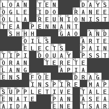 ACROSS 1. Grant temporary use of 5. Nine, plus one 8. 24-hour periods 12. Stare at amorously 13. Wedding promise 14. The wife of a rajah (variant) 15. Rounded earthenware pot or jar 16. One who advocates reunion 19. Afternoon social gathering 20. Pre-World Series prize 21. Quiet! 23. E Mali city 24. Plus 27. Petroleums 30. Johnson of "Laugh-In" 31. Chooses 34. Ache 35. Native american tent (variation) 38. A city in N France, SE of Calais 40. Inconspicuous attention getter 41. Northwest Algerian city 42. Cigar-shaped 44. Austrian-born American filmmaker Fritz 45. Capital of Western Samoa 46. Followers of ems 47. Enemy 50. To trail on the ground 53. Motivate 57. Atlas unit 59. Supplying deficiencies 63. Falsehood 64. Maternal 65. Baking dish 66. Toward the sea 67. Opera by Verdi 68. Compass dir. 69. Russian ruler of old DOWN 1. Plunder 2. Stares at amorously 3. Assad's deity 4. Teachers' org. 5. Hoop that covers a wheel 6. Genesis locale 7. Part of speech 8. One of the 12 tribes of Israel 9. Black tropical American cuckoo 10. Consenting reply 11. Put into a specified state 14. Printing process, for short 17. Tired old horse 18. _ tizzy (2 wds.) 20. Silvers or Donahue 22. Cultivating 24. Caspian sea tributary 25. Nuclear Threat Initiatives 26. Scratch 28. Directed 29. Native of Scotland 30. Seem 32. Third day of the wk. 33. "Two Mules for Sister ____" 35. Lacquered or enameled metalware 36. SW Asia republic 37. Baking dishes 39. Slangy assent 43. Event that recurs at intervals 47. Do some clerical work 48. Single 49. Eastern Standard Time (abbr.) 51. Collect or gather 52. An organ shaped like a helmet 54. Corncob 55. "Terrible" tsar 56. French philosopher Descartes 58. Lightbulb-shaped fruit 59. Ocean 60. Single; one (prefix) 61. Writing tablet 62. Parent Teacher Assoc. 63. Make lace