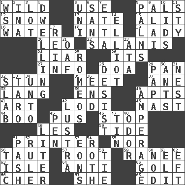 ACROSS 1. Rampant 5. Purpose 8. Friends 12. Overwhelm 13. Nathan's nickname 15. Came down and settled, as after flight 16. Wetness 18. International (abbr.) 19. Kenny Rogers chart-topper in '80 20. Lion 22. Deli grouping 24. One who doesn't tell the truth 26. ___ a Wonderful Life 27. A message received and understood 28. ___ good deed 29. Baking dish 32. Make senseless or dizzy 35. Confront 37. One (Scot) 38. Austrian-born American filmmaker Fritz 39. Followers of ems 40. Tenement units (abbr.) 41. Nonscientific branch of learning 42. Farming town in central California 43. Vertical spar for supporting sails 44. Surprise greeting 45. Suppuration 46. Obstruct or block passage 49. French article 50. Event that recurs at intervals 51. Hard copy producer 55. And not 56. Strained 57. Carrot, for example 59. Indian princess (variant) 63. Capri or Wright 64. Opposed to 65. Eighteen holes 66. "Mermaids" star 67. A female animal or person 68. Prepare for publication DOWN 1. Compass dir. 2. _ tizzy (2 wds.) 3. Car dealer's back yard 4. Home 5. University (slang) 6. Without 7. Singer James 8. Insides of hands 9. Mountain range southwest of Kyrgyzstan 10. Flaplike coverings 11. Filthy place 14. American author Paul (1891-1958) 17. It's straight from the horse's mouth 21. Clumsy lout 23. _ moment's notice (2 wds.) 25. Lover boys 28. Stop 29. Dad 30. Pismires 31. Egg locale 32. Thick slice 33. Edible starchy tuberous root 34. To (old English) 36. Conclude 40. Electrical Measurement 42. A period of five years 45. Fenced enclosure 47. Metal container 48. Scent 49. 61 cubic inches 51. Romantic infatuation 52. Court order 53. Immeasurably long periods of time 54. Writer of Portnoy's Complaint (1969) 56. Nervous spasm 58. Neckwear 60. Lower and raise head in agreement 61. Connecticut Ivy Leaguer 62. Newt