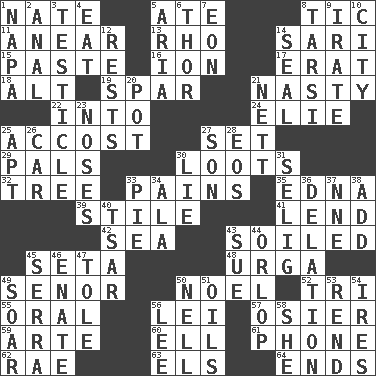 ACROSS 1. Nathan's nickname 5. Had dinner 8. Nervous spasm 11. Approach 13. 17th letter of the Greek alphabet 14. Indian skirt 15. Thick mixture 16. Electrically charged atom 17. Part of Q.E.F. 18. The first octave above the treble staff 19. Practice fight 21. Offensive 22. To the inside or interior of 24. Writer Wiesel 25. Buttonhole 27. Arrange properly for use 29. Friends 30. Plunders 32. Family _ (genealogy) 33. Aches 35. Pulitzer Prize-winning author Ferber 39. Vertical member of a panel or frame 41. Grant temporary use of 42. Ocean 43. Dirtied 45. Bristle 48. Capital and largest city of Mongolia 49. Sir (Sp.) 50. Christmas carol 52. Three (prefix) 55. Spoken 56. Flowery wreath 57. Flexible twig of a willow tree 59. Johnson of "Laugh-In" 60. Pipe bend 61. Give a jingle 62. Actress Charlotte 63. Raised railways 64. Conclusions DOWN 1. California wine valley 2. Of or related to the anus 3. A testis 4. Consume 5. Roberta Peters solo 6. Son of Odin 7. A really long time 8. Tarsus (plural) 9. Feeling or showing extreme anger 10. Municipality 12. Musical pauses 14. Lick closed 20. Plant holder 21. Remaining after all deductions 23. Olfactory organs 25. Fitting 26. Auto 27. Manchild 28. Greek goddess of the dawn 30. Falsehood 31. Former Milwaukee Brewers owner Bud 33. Sliced dessert 34. Wing 36. Accusation by an informer 37. Compass dir. 38. Say or write further 40. Russian ruler of old 43. Institute legal proceedings 44. Fourth or lowest deck 45. Spanish missionary in California 46. Maternal 47. Lacquered or enameled metalware 49. Fly high 50. 1994 drama film starring Jodie Foster 51. Lubricates 53. Tear apart 54. Angers 56. Area sheltered from the wind 58. A female animal or person