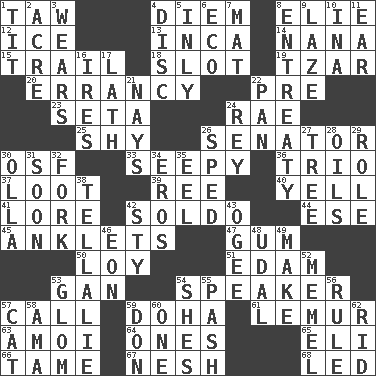 ACROSS 1. The 23rd letter of the Hebrew alphabet 4. South Vietnam president (1954) 8. Writer Wiesel 12. Frozen water 13. South American Indian 14. Nanny 15. Get behind 18. Groove 19. Russian ruler 20. Tendancy to err 22. Before (prefix) 23. Stalk of a moss capsule 24. Actress Charlotte 25. Like a shrinking violet 26. Legislator 30. Order of Saint Francis (abbr.) 33. Not well drained, as in land 36. Musical group of three 37. Spoils 39. To riddle 40. Shout 41. Old wives' tales, e.g. 42. Twentieth part of a lira 44. Compass dir. 45. Short socks 47. Chewing product 50. Myrna of the movies 51. Dutch treat 53. Separate the seeds from cotton 54. Orator 57. Give a ring to 59. Capital of the state of Qatar 61. Arboreal primate 63. Mine, in Marseilles 64. Washington bills 65. Connecticut Ivy Leaguer 66. Docile 67. Delicate 68. Directed DOWN 1. Teat (slang) 2. 43,560 square feet 3. Puts on (as clothing) 4. Flat circle 5. Inwardly 6. Environmental prefix 7. Floor protector 8. Plea 9. Goldbrick 10. _ tizzy (2 wds.) 11. Ewer handle 16. Angers 17. Thin strip of wood or metal 21. Negative votes 22. Baking dish 24. Marina Del _, California 26. Hurried 27. Family _ (genealogy) 28. Lubricates 29. Hero or heavy, e.g. 30. Water jar 31. Within a short period 32. Tined utensil 34. Greek god of love 35. Snakelike fish 38. Copy Pinocchio 42. Filthy place 43. Double curve, resembling the letter S 46. A really long time 48. Hereditary estate 49. Create 52. Klaipeda city 53. Seize upon or latch onto something 54. "______ My Girl" (Turtles hit) 55. Romantic infatuation 56. Governing power 57. Feline 58. Housemaid (var.) 59. Spanish title 60. Single 62. To free from