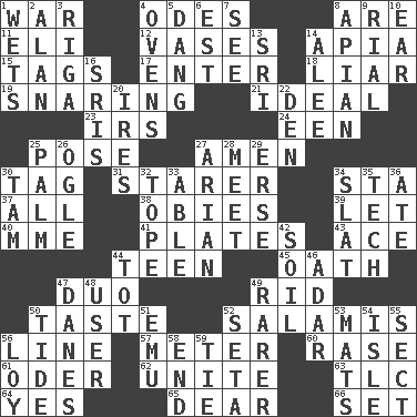 ACROSS 1. Armed conflict 4. Lyric poems 8. "We ___ not amused" (Victoria) 11. Biblical high priest 12. Flower holders 14. Capital of Western Samoa 15. Labels 17. Keyboard key 18. One who doesn't tell the truth 19. Catching in a trap 21. Standard of perfection 23. Big collection agency 24. Car or cant ending 25. Introduce or present, as a question 27. So be it 30. Label 31. A viewer who gazes fixedly 34. R.R. building 37. Everything 38. Off-Broadway awards 39. Allow 40. Madame (abbr.) 41. Food holders 43. Adept person 44. Adolescent 45. Pledge 47. Superhero pair 49. To free from 50. Clothes sense 52. Deli grouping 56. Actor's bit 57. Distance measurement 60. Raze (variant) 61. River in Europe 62. Join together 63. Affectionate concern, for short 64. Affirmative reply 65. Letter starter 66. Arrange properly for use DOWN 1. Moistens 2. Actor Alda or Thicke 3. Capital of Latvia 4. Baking chambers 5. Mild oath, euphamism for damn 6. Eastern Standard Time (abbr.) 7. Observe 8. Bee-related 9. Monetary unit of Yemen 10. Ewer handle 13. Indian title of respect (Mr.) 14. Toward shelter 16. Indian titles of respect 20. Angers 22. Lair 25. Inside of hand 26. Stare 27. Believer in; advocate of (suffix) 28. Confront 29. Celtic language 30. Scottish cap 32. Drink excessively 33. Competent 34. Narrow board 35. Technical work 36. Had dinner 42. Land 44. Small child 46. The sixth month of the Jewish calendar 47. Natives or inhabitants of Denmark 48. One who makes use of a thing 49. More uncommon 50. Periodic rise and fall of the sea level 51. Australian flightless bird 52. Bristle 53. Floor coverings 54. Small island 55. Religious group 56. Myrna of the movies 58. Conclusion 59. Neckwear
