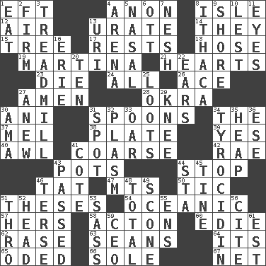 ACROSS 1. Lizard (obsolete) 4. At once, immediately (arch.) 8. Capri or Wright 12. Atmosphere 13. A salt of uric acid 14. Those people 15. Relationship diagram 17. Musical pauses 18. Stockings 19. Chrissie's court nemesis 21. Centers of feelings and intuitions 23. Pass on 24. 100% 26. Adept person 27. So be it 28. Gumbo ingredient 30. Black tropical American cuckoo 31. Soup utensils 34. Definite Article 37. Cartoonist voice _ Blanc 38. Food holder 39. It is so 40. Leather borer 41. Unrefined 42. Actress Charlotte 43. Plant holders 44. Discontinue 46. Make lace 47. Mountains (abbr.) 50. Nervous spasm 51. College papers 54. Pertaining to the sea 57. Possessive pronoun 58. 13-14th century defensive garment 60. Singer Brickell 62. Raze (variant) 63. Actors Connery and Penn 64. ___ a Wonderful Life 65. Wrote a lyric poem 66. Not divided or shared with others 67. Fish or hair follower DOWN 1. Ingest 2. Unshakable 3. Excercise machine 4. Sports stadium 5. Relating to the nose 6. Baseball player Mel 7. Delicate 8. New York city 9. Dinah or Pauly 10. For fear that 11. Snake ____ (dice throw) 13. RI univ. 16. One of the Great Lakes 20. "___ Little Indians" 22. Hearing organs 25. Plunders 27. Afresh 29. Leg joint 30. Housemaid (var.) 31. Specific locale 32. Suffix with ecto or cyto 33. Rowing implement 34. Polypeptide antibiotic 35. Pile 36. Compass dir. 41. ____ d'Azur (French Riviera) 43. Went by 44. R.R. building 45. Prong on a fork 46. Laconic 48. "_____ Recall" 49. Biscuitlike quick bread 51. Through, poetically 52. Froth on beer 53. Backtalk 55. Followers of ems 56. Quote 59. Corporate head (abbr.) 61. Eastern Standard Time (abbr.)
