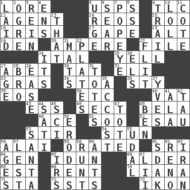 ACROSS 1. Old wives' tales, e.g. 5. United States Postal Service (abbr.) 9. Affectionate concern, for short 12. Representative 14. Vintage cars 15. Friend of Pooh 16. From or relating to Ireland 17. Open wide 18. Keyboard modifier key 19. Lair 20. Electrical Unit 23. Do some clerical work 24. Slanted text style (abbr.) 25. Shout 27. Collude with 30. Make lace 32. Connecticut Ivy Leaguer 33. Pate de foie ____ 34. Portico 36. Filthy place 38. Greek goddess of the dawn 39. And so on (abbr.) 40. Large container 43. Double-curved letter 46. Religious group 48. Actor Lugosi 49. Adept person 51. "Barney Miller" actor Jack 52. He sold his birthright 53. Use a swizzle stick 54. Make senseless or dizzy 56. Jai ____ 58. Declaimed 61. _ Lanka 64. Commissioned mil. rank 65. Goddess of spring and wife of Bragi 66. Tree or shrub in the Birch family 68. Eastern Standard Time (abbr.) 69. Monthly bill 70. Woody, climbing, usually tropical plant 71. R.R. building 72. Fast planes 73. Picture DOWN 1. Put down 2. Legendary monster 3. It's straight from the horse's mouth 4. Followers of ems 5. Goad 6. Dry up 7. Wimpy's pal 8. Compass dir. 9. Lag or linger behind 10. Hang loosely or laxly 11. ____ d'Azur (French Riviera) 13. Not this but _ 21. Floor coverings 22. Food holders 23. Sudden quick movement 24. It is 26. Raised railways 27. Ripen 28. Sis' sibling 29. Comfort 31. Lugs 35. Buttonhole 37. Jacques Cousteau's middle name 41. Wing 42. The 19th letter of the Greek alphabet 44. Suttee (variant) 45. _-fi 47. Haul 48. Benjamin's nick name 50. Eats (away) 53. Before Barbara or Clara 55. Hereditary estate 56. Eras 57. For fear that 59. The smallest animal of a litter 60. Pismires 61. Neighbor of Neb. 62. Western Nevada city 63. SW Asia republic 65. Big collection agency 67. Cards in a Roman deck?