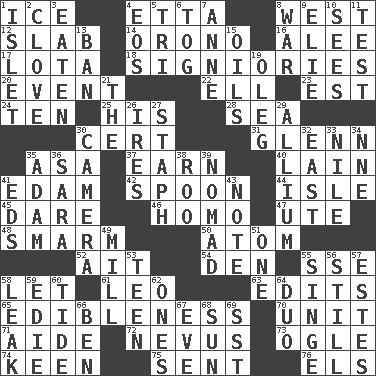 ACROSS 1. Frozen water 4. Singer James 8. Compass direction 12. Thick slice 14. U. of Maine site 16. Toward shelter 17. Globular water bottle used in Asia 18. Seigniories (variant) 20. Happening 22. Pipe bend 23. Eastern Standard Time (abbr.) 24. Nine, plus one 25. Part of HMS, perhaps 28. Ocean 30. Foregone conclusion 31. American astronaut and politician John 35. White ___ sheet 37. Merit 40. (Had) reclined 41. Dutch treat 42. Soup utensil 44. Small island 45. Have the gumption 46. Like (prefix) 47. Shoshoni 48. Excessive but superficial compliments 50. Smallest unit of an element 52. Small island 54. Lair 55. Compass dir. 58. Allow 61. Lion 63. Proofreads 65. The property of being fit to eat 70. A single undivided whole 71. Helper 72. Congenital growth or mark on the skin 73. Stare 74. Peachy ____! 75. Emitted 76. Raised railways DOWN 1. Small island 2. Garlic unit 3. Eroded 4. Greek goddess of the dawn 5. Three (prefix) 6. Coat; cloak 7. Singer Murray 8. Armed conflict 9. Writer Wiesel 10. Perceives with the eye 11. Trial 13. Prohibit 15. Lubricates 19. Cassini of fashion 21. Definite Article 26. Angers 27. Staphylococcus 29. Plant genus of onion and garlic 30. Device for capturing images 32. Compass direction 33. "Death on the ____" 34. Compass dir. 35. First of billions? 36. "Two Mules for Sister ____" 38. Friend of Pooh 39. Wanderer 41. Begley and Asner 43. Musical sound 49. Place where flour is made 51. Single 53. Adolescent 55. Burn superficially 56. Free from disturbance or agitation 57. _____ Park, CO 58. Path through which fluid escapes 59. Singer Brickell 60. Event that recurs at intervals 62. Singles 64. Superhero pair 66. Benjamin's nick name 67. First lady 68. Player for Phoenix 69. Fast jet (abbr.)