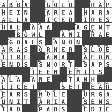 ACROSS 1. Swedish rock group 5. Gilded 9. Strike 12. Count _ (2 wds.) 13. Type of rug 14. Hindu Mythology: god of death 15. Silent film actress Nazimova 16. On the rocks 17. Angers 18. Actor Linden 19. American Automobile Association (abbr.) 21. Rep 22. Soup holder 24. Black tropical American cuckoo 26. Actress Charlotte 27. Scores awarded for successful feats 28. Soon (poet.) 29. Ancient river in northeast Turkey 30. Channel Islands abalone 32. _ gin 36. Become fatigued 37. Housemaid (var.) 38. Age 39. Conclusions 40. Derisive sound 42. Plant excrements 43. Adolescent 44. Sends forth 46. Chicken ___ king 49. A saturated hydrocarbon 50. Hyperbolic tangent 51. It is permitted: Lat. 53. Put into a specified state 54. Hearing organ 57. Hearing organs 58. Undercover agent 61. Capital and largest city of Mongolia 62. A single undivided whole 63. Operatic vocal solo 64. Elected reps. 65. Small amount or degree 66. Groovy apts. 67. Singer Brickell DOWN 1. Wet nurse 2. Actor Lugosi 3. Big road sign 4. Santa ___, CA 5. Greek goddess of the earth (variant) 6. The grampus (Milton) 7. Area sheltered from the wind 8. Male parent 9. More valued for its uncommonness 10. Sports stadium 11. Thick mixture 14. Russian fighter aircraft 19. Leather borer 20. In addition 21. The 18th letter of the Arabic alphabet 23. Fertile tracts in a desert 24. Approach 25. Or not 27. Smile widely 28. ID or VA city 29. Had dinner 31. The wife of a rajah (variant) 32. Indian antelope 33. Tough but pliablecoriaceous 34. I made a mistake 35. Followers of ems 40. Elected rep. 41. False hair 43. Make lace 45. Floor protector 46. Eskimo relative 47. Climbing, woody, usually tropical vines 48. Sour-tasting 52. Eastern Standard Time (abbr.) 53. Oceans 55. Hindu god of fire 56. Raze (variant) 58. Atlas unit 59. Mouth or opening 60. Hat (slang) 61. Purpose