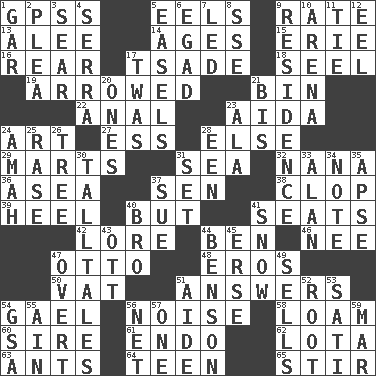 ACROSS 1. Global Positioning Systems (abbr.) 5. Snakelike fish 9. Pace 13. Toward shelter 14. Ripens 15. 4th largest of the Great Lakes 16. Rump 17. Sadhe (variant) 18. Sew up the eyelids of hawks and falcons 19. Moved like an arrow 21. Storage container 22. Of or related to the anus 23. Opera by Verdi 24. Nonscientific branch of learning 27. Curvy letter 28. Otherwise 29. Shops 31. Ocean 32. Nanny 36. At sea 37. Elected rep. 38. Hoof sound 39. Person who is morally reprehensible 40. On the contrary 41. Theater features 42. Old wives' tales, e.g. 44. Benjamin's nick name 46. Born 47. Von Bismarck 48. Greek god of love 50. Large container 51. Responses 54. Highlander 56. Annoying sound 58. Rich soil 60. Title for a man of rank and authority 61. Inside; within (prefix) 62. Globular water bottle used in Asia 63. Pismires 64. Adolescent 65. Tumult DOWN 1. Slender fish 2. Entreaty 3. Shrivel 4. Spanish missionary in California 5. Artist's stands 6. Mild oath 7. Directed 8. Compass dir. 9. Dwelling 10. Sports stadium 11. Standoff 12. Snakelike fish 17. It was, poetically 20. Washington bills 21. Twice 23. Wing 24. Housemaid 25. Raze (variant) 26. Relationship diagram 28. Car or cant ending 30. Baron Munchausen's specialties 31. Arrange properly for use 33. ____ Jay Lerner 34. Make mention of 35. Domed church section 37. Take to court 40. Sis' sibling 41. Overwhelm 43. Baseball player Mel 44. Gillaume's butler role 45. Celtic language 47. Unconcealed 49. Exchanges for money 51. Helper 52. Carrot, for example 53. Suttee (variant) 54. Girls' org. (abbr.) 55. The 18th letter of the Arabic alphabet 56. Fish or hair follower 57. Single 59. Make imperfect