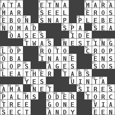 ACROSS 1. "One Day ___ Time" 4. Inactive volcano in Sicily 8. Hindu Mythology: god of death 12. Third mo. 13. Sew up the eyelids of hawks and falcons 14. Greek god of love 15. Inky black, to poets 17. Fastener 18. First-year military academy student 19. Roamer 21. Health resort 23. Ocean 24. Fertile tracts in a desert 26. Binary compound 28. It was, poetically 30. Nestling 34. Trim (branches) 37. Printing process, for short 39. Riding implement 40. Chief or king in Benin or Nigeria 41. Empty; void 43. Followers of ems 44. Chops off 46. Grows older 47. Mayday 48. Cordwainer's material 51. Bar bills 54. It is so 55. National forest in Provo, Utah 58. Housemaid (var.) 61. Fish or hair follower 63. Male parents of animals 65. Insides of hands 67. Baltic tributary 71. Torque (variant) 72. Woody plant 73. Went 74. By way of 75. Religious group 76. "60 Minutes" Commentator Rooney 77. Car or cant ending DOWN 1. So be it 2. Off limits 3. Odor 4. Curvy letter 5. Nine, plus one 6. Teachers' org. 7. High mountains 8. Cartoonist voice _ Blanc 9. Ancient Greek god of war 10. Loose flowing garment 11. At sea 16. Political cartoonist Thomas 18. Groovy apts. 20. Morning condensation 22. Sliced dessert 25. Indian skirt 27. And so on (abbr.) 29. Underwater navigation system 30. Music written for nine 31. Angers 32. Words to Nanette 33. Global Positioning Systems (abbr.) 34. Hang loosely or laxly 35. Mitch Miller's instrument 36. Dad 38. Label 42. He sold his birthright 45. Filthy place 49. Coop moms 50. Compass dir. 52. Again 53. In a ____ (agitated or irritated) 56. Collection of objects 57. Nest on high 58. Tenement units (abbr.) 59. Female horse 60. Actor Baldwin 62. Ancient Roman robe 64. Examine minutely or intensely 66. Was introduced to 68. Spanish title 69. Conclusion 70. Marina Del _, California