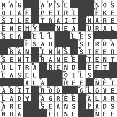 ACROSS 1. Tired old horse 4. Domed church section 8. Distress signal 11. Norwegian king 13. _ dish (used to culture cells) 15. Make supply last 16. Filth; sediment 17. Distinguishing feature 18. Female horse 19. Foe 21. Teachers' org. 22. Mountain range 23. Ocean 24. Pipe bend 27. French article 29. He sold his birthright 30. Spanish missionary in California 34. Prohibit 36. Restaurants 39. Guide 40. Posted 41. The wife of a rajah (variant) 43. Portable shelter 44. Extreme 46. Tear apart 47. Bank Draft (abbr.) 48. Artist's stand 49. Petroleums 51. According to 53. To separate or throw off 54. Fish or hair follower 57. "This won't hurt ____!" 60. Friend of Pooh 63. Michael Jackson trademark 65. Kenny Rogers chart-topper in '80 66. Match 69. Having or resembling wings 70. "We ___ not amused" (Victoria) 71. Seines 72. Groovy apts. 73. Basketball assoc. 74. Otherwise 75. Born DOWN 1. Olfactory organs 2. Place in a line 3. An organ shaped like a helmet 4. Fitting 5. For each 6. Comedian Laurel of Laurel & Hardy 7. 4th largest of the Great Lakes 8. Singe 9. Gumbo ingredient 10. Stitch closed the eyes of (a falcon) 12. Opposite of masc. 14. Slanted text style (abbr.) 18. French bagpipes 20. Consenting reply 25. Den 26. Type of eclipse 28. Curvy letter 29. Plea 31. Coral collection 32. Monthly bill 33. Nonscientific branch of learning 34. Actor Lugosi 35. Pismires 37. Compass dir. 38. Sir (Sp.) 40. Institute legal proceedings 42. Singer Brickell 45. Everything 50. Part of a journey 52. Ancient river in northeast Turkey 54. Pitcher Ryan 55. Dodge 56. Laconic 57. ____ Jay Lerner 58. Sharp remark 59. The content of cognition 61. Double curve, resembling the letter S 62. Relating to the mouth 64. Pet locale 67. Followers of ems 68. Compass dir.