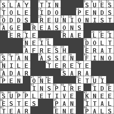 ACROSS 1. Kill 5. Shallow baking pan 8. Takes to court 12. Lacquered or enameled metalware 13. Wedding promise 14. Depends 15. Likelihood 16. One who advocates reunion 19. Personal question 20. Thinks logically 21. 4th largest of the Great Lakes 23. Actress Charlotte 24. Luau accessory 27. Famous astronaut Armstrong 30. Stupid person 31. Anew 34. Part of Q.E.F. 35. Comedian Laurel of Laurel & Hardy 38. NE Netherlands city 40. A pale, very dry sherry 41. The longest river in the world 42. Cigar-shaped 44. The sixth month of the Jewish calendar 45. "Two Mules for Sister ____" 46. Fenced enclosure 47. Single 50. Needle holder 53. Heighten or intensify 57. Binary compound 59. Supplementary 63. Leg joint 64. _____ Park, CO 65. Baking dish 66. Slanted text style (abbr.) 67. Pull apart 68. Compass dir. 69. Friends DOWN 1. Portico 2. Inn 3. Tree or shrub in the Birch family 4. It is so 5. Hoop that covers a wheel 6. The main thing one is thinking about 7. Horse sense 8. Elected rep. 9. Single; one (prefix) 10. Begley and Asner 11. Fast jet (abbr.) 14. Airs 17. And not 18. _ tizzy (2 wds.) 20. Coral ridge 22. Sillier 24. Australian parrot (variant) 25. Flair 26. "Tell ____ the Marines!" 28. Retirement account (abbr.) 29. For fear that 30. Outscore 32. Compass dir. 33. Possessive pronoun 35. Fastener 36. Periodic rise and fall of the sea level 37. Actor Alda or Thicke 39. Teachers' org. 43. Woody plant 47. Petroleums 48. Compass dir. 49. Eastern Standard Time (abbr.) 51. National forest in Provo, Utah 52. Perfect 54. Corncob 55. "Terrible" tsar 56. French philosopher Descartes 58. Snakelike fish 59. Arrange properly for use 60. Purpose 61. Parent Teacher Assoc. 62. For each 63. Monetary unit of Laos