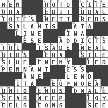 ACROSS 1. Layer 4. Printing process, for short 8. Quote 12. Mouth or opening 13. Prepare for publication 14. Freehold land 15. Hauls 18. Remaining after all deductions 19. Confederate soldiers (slang) 20. Deli grouping 22. "One Day ___ Time" 23. Actor's bit 24. _ tizzy (2 wds.) 25. Compass dir. 26. Inveterate users 30. Three (prefix) 33. Sadhe (variant) 36. Anneal 37. Auction offers 39. Epoch 40. Drop; flow; fall 41. Change direction abruptly 42. Foe 44. Directed 45. Pre-World Series prize 47. Curvy letter 50. One (Scot) 51. Grant temporary use of 53. Call ___ day 54. Normal relaxed breathing 57. To (old English) 59. Conclusions 61. A sleeping potion; an opiate (poet.) 63. Scorch 64. Shed a tear 65. Myrna of the movies 66. Snakelike fish 67. Immeasurably long periods of time 68. Observe DOWN 1. Being at a high temperature 2. Greek god of love 3. Relating to or accompanying birth 4. Painter Guido (1575-1642) 5. Lyric poems 6. Teat (slang) 7. Baseball player Mel 8. Window treatments 9. The main thing one is thinking about 10. Keyboard key 11. Raised railways 16. Writer Wiesel 17. Without 21. Rendezvous 22. Added to 24. Binary compound 26. First man 27. To provide with a ceiling 28. Story 29. Downhill vehicle 30. Cook's measure (abbr.) 31. Cause heat under the collar 32. Goddess of spring and wife of Bragi 34. Emitted 35. "We ___ not amused" (Victoria) 38. Elected representatives 42. Compass dir. 43. Sharp bark 46. Santa ___, CA 48. Post 49. Overwhelm 52. Allots cards 53. Slanted text style (abbr.) 54. Locale of original sin 55. United States Postal Service (abbr.) 56. Medicinal plant 57. Purpose 58. Born 59. She-sheep 60. Modern: prefix 62. Sight organ