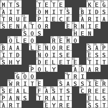 ACROSS 1. Mountains (abbr.) 4. False hair 8. Barrel 11. Small island 12. Leaves out 14. Auction offers 15. Loyal 17. Part 18. Operatic vocal solo 19. Elected representative 21. Bert's buddy 23. Mayday 24. Layer 25. Margarine 27. San ____ (Riviera town) 30. Sound made by sheep 31. Poe poem 34. Plant excrement 37. It would 38. Annoying sound 39. Double-curved letter 40. Like a shrinking violet 41. Keyboard key 43. Teat (slang) 44. More than one (prefix) 45. The sixth month of the Jewish calendar 47. Thick or sticky substance 49. Three (prefix) 50. Compose 52. More lively and spirited 56. Lick closed 57. Goes without food and/or water 60. Algonquian 61. Baking dishes 62. Distinguishing feature 63. Raised railways 64. Nonscientific branch of learning 65. Jane of fiction 66. Fast jet (abbr.) DOWN 1. Floor coverings 2. Hoop that covers a wheel 3. Make senseless or dizzy 4. Traditional theme or motif 5. Arab leader 6. Neckwear 7. And so on (abbr.) 8. Japanese brewing company 9. Singer Brickell 10. Girls' org. (abbr.) 13. Observe 14. Object of repulsion 16. Relaxation 20. Instrument 22. 17th letter of the Greek alphabet 25. Pledge 26. Kenny Rogers chart-topper in '80 27. Agitated, as a liquid 28. Celtic language 29. Confront 30. Twice 32. Inside; within (prefix) 33. Christmas carol 34. Stalk of a moss capsule 35. SW Saudi Arabia district 36. Pacific Standard Time (abbr.) 42. Hearing organs 44. Cooking vessel 46. Compact _ 47. Let have 48. Petroleums 49. Clothes sense 50. Erode 51. Newt 52. Use a swizzle stick 53. Angers 54. Snakelike fish 55. Relief 56. Health resort 58. "We ___ not amused" (Victoria) 59. Declare