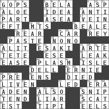 ACROSS 1. Republicans 5. Actor Lugosi 9. Viper 12. Medicinal plant 13. The main thing one is thinking about 14. Opposed to 15. Component 16. Toward the sea 17. Distinctive style or manner 18. Bank Draft (abbr.) 19. Mountains (abbr.) 21. Memphis, Tenn. Street 22. Posterior 24. Automobile 26. Marina Del _, California 27. Thick mixture 28. Words to Nanette 29. Set down 30. 1973 Nobel Price Winner (Physics) Leo 32. Johnson of "Laugh-In" 36. False hair 37. Compass dir. 38. Path through which fluid escapes 39. Comfort 40. Suffix with ecto or cyto 42. Small island 43. Small valley 44. Bert's buddy 46. Before (prefix) 49. Followers of ems 50. Passed on 51. Make or become more lively 53. Directed 54. Period 57. Arabian gulf 58. In addition 61. Sever or remove by pinching or nipping 62. Watch over 63. One who doesn't tell the truth 64. Jazz singing style 65. Eastern Standard Time (abbr.) 66. Native american tent (variation) 67. Snakelike fish DOWN 1. Yawn 2. Norwegian king 3. Likenesses of persons 4. Put into a specified state 5. Prejudice 6. Begley and Asner 7. Area sheltered from the wind 8. American Automobile Association (abbr.) 9. Approach 10. Vertical member of a panel or frame 11. Abounding in pines 14. "___ Maria" 19. Floor covering 20. Relationship diagram 21. Sis' sibling 23. First name in cosmetics 24. Popular sodas 25. Cuckoo 27. Entreaty 28. Rhinal 29. Had dinner 31. Makes a sale 32. Place in a line 33. Home 34. Falsehood 35. Supplement with great effort 40. Writing instrument 41. Ancient Persian 43. Lair 45. To free from 46. Food holder 47. Amusement-park features 48. Happening 52. Conclude 53. Australian parrot (variant) 55. Monetary unit of Yemen 56. Flats, for short 58. The first octave above the treble staff 59. Cards in a Roman deck? 60. Plant excrement 61. Compass dir.