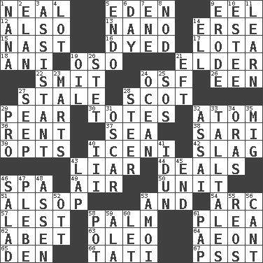 ACROSS 1. Be tempered by heat 5. Genesis locale 9. Snakelike fish 12. In addition 13. Billionth: prefix 14. Celtic language 15. Political cartoonist Thomas 16. Colored 17. Globular water bottle used in Asia 18. Black tropical American cuckoo 19. Bear (Spanish) 21. A person who is older than you are 22. Stricken, poetically 24. Order of Saint Francis (abbr.) 26. Car or cant ending 27. Showing deterioration from age 28. Native of Scotland 29. Lightbulb-shaped fruit 30. Hauls 32. Tiny particle 36. Monthly bill 37. Ocean 38. Indian skirt 39. Elects 40. Ancient Celtic tribe of eastern Britain 42. Volcanic refuse 43. One who doesn't tell the truth 44. Allots cards 46. Health resort 49. Atmosphere 50. A single undivided whole 51. Columnist Joseph or Stewart 53. Plus 54. Curve 57. For fear that 58. Inside of hand 61. Entreaty 62. Collude with 63. Margarine 64. Age 65. Lair 66. Jacques of French films 67. Inconspicuous attention getter DOWN 1. Nanny 2. Enthusiasm 3. Aide 4. Car dealer's back yard 5. Inside; within (prefix) 6. 24 hours 7. Compass dir. 8. Allow head to fall sleepily 9. Eat (away) 10. First name in cosmetics 11. Memorize 14. Pipe bend 19. Lubricate 20. Proofreading order 21. Lizard (obsolete) 23. Shops 24. Sea 25. Distress signal 27. Ooze 28. Navigate 29. Adept person 31. Witty Wilde 32. Slender Brazilian palm 33. Baron Munchausen's specialties 34. Mouths or openings 35. Russian fighter aircraft 40. One more than two 41. Goddess of spring and wife of Bragi 43. Pet locale 45. Conclusion 46. Vegetable dish 47. Military trainee 48. NE Netherlands city 52. Baseball player Mel 53. Mine, in Marseilles 55. Vintage cars 56. Patter 58. Plant holder 59. In the manner of 60. Allow 61. Infant food