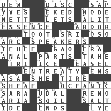 ACROSS 1. Morning condensation 4. Flat circle 8. Plant excrement 11. Jacques Cousteau's middle name 13. Supplemented with great effort 14. Method 15. Remaining after all deductions 16. Allows 17. Set down 18. Substance 21. Zeal 22. A blast of a horn 23. Indian title of respect (Mr.) 25. Bear (Spanish) 26. Curve 29. Orators 32. Giggle 34. E Mali city 35. Period 38. Of or related to the anus 39. Pieces 41. Not wild 43. Three (prefix) 44. Frozen water 45. Artist's stand 46. Plea 50. Followers of ems 51. White ___ sheet 54. A female animal or person 55. Become fatigued 57. Archer's quiver 59. Pertaining to the sea 63. "Two Mules for Sister ____" 64. Allodial 67. Former U.S. Attorney General Janet 68. Operatic vocal solo 69. Earth 70. Table seasoning 71. Binary compound 72. Conclusions 73. Potassium hydroxide DOWN 1. Centimeter-gram-second unit of force 2. Nights before holidays 3. Moistens 4. Erase 5. D.D.E's nickname 6. Arrange properly for use 7. Music discs 8. Twentieth part of a lira 9. Goodbye (Sp.) 10. Stone: prefix 12. Proofreading order 14. Spoil 19. Olfactory organ 20. Police officer (slang) 21. Wind 23. Three-handed card game 24. Vintage cars 26. _ moment's notice (2 wds.) 27. Monthly bill 28. Burn to charcoal 30. Match 31. Stalk of a moss capsule 33. Writer Wiesel 36. Raze (variant) 37. So be it 39. Essential or central part 40. Land measure 42. Raised railways 45. Jane of fiction 47. Overdraft (abbr.) 48. Ringlike coral islands and reefs 49. Nervous spasm 51. Slender Brazilian palm 52. Broken piece 53. Nest on high 56. Hearing organs 58. Auto club (abbr.) 60. Anneal 61. In an inward manner 62. ____ d'Azur (French Riviera) 64. Purpose 65. Spanish title 66. Assist