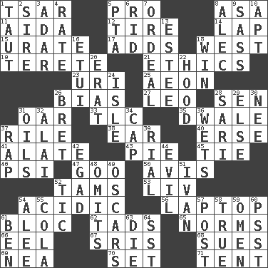 ACROSS 1. Russian ruler of old 5. Adept person 8. White ___ sheet 11. Opera by Verdi 12. Become fatigued 14. Infant locale 15. A salt of uric acid 17. Does sums 18. Compass direction 19. Cylindrical with tapered ends 21. Principles of right and wrong 23. RI univ. 25. A really long time 26. Prejudice 27. Lion 28. Elected rep. 31. Boat paddle 33. Affectionate concern, for short 35. A sleeping potion; an opiate (poet.) 37. Cause heat under the collar 38. Ewer handle 40. Celtic language 41. Having winglike extensions 43. Sliced dessert 45. Make a knot 46. 23rd letter of the Greek alphabet 47. Thick or sticky substance 50. Deliberation 52. Scottish caps 53. 54 in ancient Rome 54. Being or containing an acid 56. Portable computer 61. Alliance 62. Small amounts or degrees 65. Typical standards 66. Snakelike fish 67. Indian titles of respect 68. Institutes legal proceedings 69. Teachers' org. 70. Put into a specified state 71. Portable shelter DOWN 1. Tense 2. Father 3. The sixth month of the Jewish calendar 4. Assign a rank or rating to 5. Parent Teacher Assoc. 6. To free from 7. Severe or trying experience 8. Actor Baldwin 9. Backtalk 10. Fitting 13. First name in cosmetics 16. Needle case 18. Acquire through effort 20. Part of Q.E.F. 22. Parka part 24. Capri or Wright 26. Cy Young winner Saberhagen 28. Indian skirt 29. Otherwise 30. Born 31. Lubricates 32. Jai _ 34. Head covering 36. Moistens 37. Hit sharply and swiftly 39. Monetary unit of Yemen 42. Mild oath 44. Tending to cause great harm 48. Leaves out 49. Motion picture awards 51. "Terrible" tsar 52. Nervous spasm 54. Toward shelter 55. Root beer relative 57. Mail 58. Loyal 59. Sign of things to come 60. Inconspicuous attention getter 61. Benjamin's nick name 63. Pass on 64. Fast jet (abbr.)
