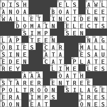 ACROSS 1. Food container 5. Raised railways 8. Leather borer 11. Small Philippine buffalo 12. Water vessel 13. Area sheltered from the wind 14. Place for singles 17. Event 19. Kingdom 21. Chooses 22. Simple or foolish person 23. Elected rep. 24. Pet locale 27. Adolescent 29. Tired old horse 32. Off-Broadway awards 34. Auto 36. Promenade 37. Trig term 38. _ moment's notice (2 wds.) 39. Son of Isaac 40. Locale of original sin 41. Feline 42. Food holder 43. Marina Del _, California 44. Welles in "The Third Man" 46. French article 47. American Automobile Association (abbr.) 50. Pledge 52. A viewer who gazes fixedly 55. Main course 57. Coward 59. Fodder prepared in a silo 62. Period 63. Naughty children 64. Angers 65. Spanish title 66. Consume 67. Washington bills DOWN 1. Fool 2. _ tizzy (2 wds.) 3. Disposed of to a purchaser 4. Auras 5. Period of immesurable duration 6. Shoestrings 7. Vertical member of a panel or frame 8. Actor Baldwin 9. Gone 10. Allows 12. Storage container 15. Sends forth 16. Docile 18. Lair 20. Medicinal drug used to evoke vomiting 24. Failure 25. Stay 26. Abounding in pines 28. Brizilian seaport 29. Rhinal 30. Having winglike extensions 31. Cements 33. Car or cant ending 35. Food allowance for one day 36. Cartoonist voice _ Blanc 42. _ dish (used to culture cells) 45. Floor protectors 47. Tate display 48. Nest on high 49. Scent 51. Sun: prefix 52. Broke a traffic law 53. "Corrida" creature 54. Actor Alda or Thicke 55. Followers of ems 56. Merit 58. Choose 60. Turn to the right 61. Double-curved letter
