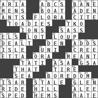 ACROSS 1. Roberta Peters solo 5. Lettered men learn these first 9. Object of repulsion 13. Not women's 14. Water vessel 15. Arabian gulf 16. Pismires 17. Plants 18. Quote 19. Sycophants 21. Ring climax 22. Charged particles 23. Backtalk 24. Raised railways 27. Car dealer's back yard 28. Central Nebraska county 29. Started a card game 31. Lair 32. Sums up 36. Capri or Wright 37. Single; one (prefix) 38. Algonquian 39. Singer James 40. Mouth or opening 41. Intended 42. Jacques of French films 44. White ___ sheet 46. Girls' org. (abbr.) 47. Not this but _ 48. Hoop that covers a wheel 50. Ocean 51. Mood resulting from idleness 54. Austrian river, tributary to the Danube 56. Having lost freshness 58. Small, secluded valley 60. Travel on or in a vehicle 61. Land elevation 62. Toward shelter 63. Moved rapidly 64. Cloth borders 65. Pace DOWN 1. Housemaid (var.) 2. Monthly bill 3. To the inside or interior of 4. Slender Brazilian palm 5. Most capable 6. Expressions of contempt or scorn 7. Automobile 8. R.R. building 9. Keyboard key 10. Goodbye (Sp.) 11. Fish or hair follower 12. Compass dir. 17. A pale, very dry sherry 20. Stupid person 21. The 19th letter of the Greek alphabet 23. Male offspring 24. Singer Brickell 25. For fear that 26. Table seasoning 28. Flowery wreath 30. Resembling or made to resemble leather 31. Heredity factor (abbr.) 33. To be drawn or hauled along 34. Cub Scout units 35. Stalk of a moss capsule 37. RI univ. 40. Baseball player Mel 41. Female horse 43. Auto club (abbr.) 44. Ringlike coral islands and reefs 45. Father 47. Sadhe (variant) 49. _ Allan Poe 51. Lip ointment 52. Rounded earthenware pot or jar 53. Confront 54. Big collection agency 55. Small drink 56. Quiet! 57. Make a knot 59. Born