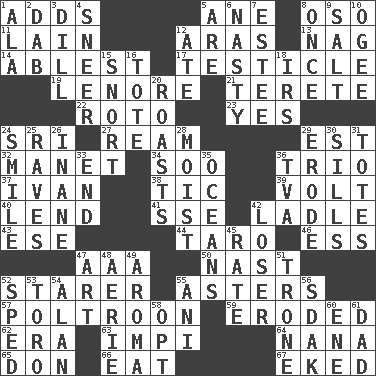 ACROSS 1. Sums up 5. One (Scot) 8. Bear (Spanish) 11. (Had) reclined 12. Caspian sea tributary 13. Tired old horse 14. Most capable 17. One of the two male reproductive glands 19. Poe poem 21. Cigar-shaped 22. Printing process, for short 23. It is so 24. Indian title of respect (Mr.) 27. 480, 500 or 516 sheets of paper 29. Eastern Standard Time (abbr.) 32. French painter Edouard 34. "Barney Miller" actor Jack 36. Musical group of three 37. _ the terrible 38. Nervous spasm 39. Electrical Unit 40. Grant temporary use of 41. Compass dir. 42. Dipping utensil 43. Compass dir. 44. Edible starchy tuberous root 46. Double-curved letter 47. Auto club (abbr.) 50. Political cartoonist Thomas 52. A viewer who gazes fixedly 55. Michaelmas daisies 57. Characterized by complete cowardliness 59. Worn away 62. Period 63. Body of Kaffir warriors 64. Grandmother 65. Spanish title 66. Consume 67. Supplemented with great effort DOWN 1. According to 2. Apply (a substance) by light strokes 3. Deli pickle 4. Contemptuous expression 5. "We ___ not amused" (Victoria) 6. Difficult 7. First name in cosmetics 8. At one time in the past 9. Table seasoning 10. Double curve, resembling the letter S 12. Had dinner 15. Derisive sound 16. Carryall 18. Big collection agency 20. Exposes to great heat 24. Grin 25. All-night dance parties 26. Empty; void 28. Wet 29. Eat (away) 30. Beverly of Met fame 31. Hauls 33. Conclusion 35. Seas 36. Federal power corp. 42. Failure 45. Pace 47. Tate display 48. Nest on high 49. Odor 51. Heavy duty weighing machine 52. Hurried 53. "Corrida" creature 54. Actor Alda or Thicke 55. Cuckoo 56. Neighbor of Neb. 58. Choose 60. Compass dir. 61. June honoree