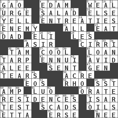 ACROSS 1. E Mali city 4. Dutch treat 8. Welt 12. Goad 14. First course 16. Otherwise 17. Shout 18. Pleas 20. Foe 22. Everything 23. Erode 24. June honoree 25. Connecticut Ivy Leaguer 28. French article 30. SW Saudi Arabia district 31. High-altitude cloud 35. Scottish cap 37. Calm and collected 40. Grant temporary use of 41. Canvas cover 42. World-weariness 44. Enthusiastic 45. Toward shelter 46. Transmitted 47. Commissioned mil. rank 48. Lacerates 50. Measure of real estate 52. Greek goddess of the dawn 54. 17th letter of the Greek alphabet 55. Fast jet (abbr.) 58. Electrical Unit 61. Nilotic language 63. Declaim 65. Dwellings 70. Austrian river, tributary to the Danube 71. Trial 72. Large numbers or amounts 73. Petroleums 74. Singer James 75. Celtic language 76. Born DOWN 1. Secured 2. Sports stadium 3. Stared 4. Compass dir. 5. Daniel's nick name 6. The first octave above the treble staff 7. Hindu Mythology: god of death 8. Soggy 9. Writer Wiesel 10. At sea 11. For fear that 13. Shade tree 15. Small valley 19. Actor Baldwin 21. Affirmative reply 26. Louse (plural) 27. Metal shackles 29. Fodder prepared in a silo 30. Electrical Unit 32. Be footloose 33. Water falling in drops from the sky 34. Working for oneself (abbr.) 35. Falsehood 36. Type of rug 38. Single 39. Type of eclipse 41. Make lace 43. Hankering 49. Exchanged or delivered for money 51. Friend of Pooh 53. Institutes legal proceedings 55. Indian antelope 56. Showing deterioration from age 57. Laconic 58. Johnson of "Laugh-In" 59. Confront 60. Inconspicuous attention getter 62. At one time in the past 64. _ de Janeiro 66. Call ___ day 67. Auto 68. Begley and Asner 69. Compass dir.