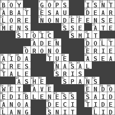 ACROSS 1. Male child 4. Republicans 8. Is not 12. Blind as ____ 14. He sold his birthright 15. Letter starter 16. Old wives' tales, e.g. 17. Unrelated to defense, as in spending 20. Not women's 21. Compass dir. 22. Had dinner 23. Unemotional 27. Stricken, poetically 29. Arabian gulf 31. Dunce 34. U. of Maine site 35. One of the Great Lakes 36. Opera by Verdi 39. Third day of the wk. 41. At sea 42. Angers 43. Relating to the nose 46. Story 47. Indian titles of respect 48. American tennis player Robert 51. Connects, as a bridge 54. Dripping 56. "___ Maria" 58. Inside; within (prefix) 61. The property of being fit to eat 66. Stated 67. Small Philippine buffalo 68. Tenth: prefix 69. Event that recurs at intervals 70. Long (Scottish) 71. In a ____ (agitated or irritated) 72. Hat (slang) DOWN 1. Lip ointment 2. Mitch Miller's instrument 3. Tall tales 4. Commissioned mil. rank 5. Bear (Spanish) 6. Baking dish 7. Beer foam 8. Binary compound 9. Elected representatives 10. Political cartoonist Thomas 11. Woody plant 13. Trial 18. Double-curved letter 19. Opposite of masc. 24. Boat paddle 25. Wedding promise 26. Penny 28. Standard of perfection 30. Parts of speech 32. Falsehood 33. Afternoon social gathering 34. Fertile tracts in a desert 36. Small island 37. Retirement account (abbr.) 38. Conveyance 40. Hearing organs 44. Small drink 45. White ___ sheet 49. Actor Linden 50. First lady 52. Egg locale 53. Slow-paced one 54. Welt 55. Pulitzer Prize-winning author Ferber 57. Extremities 59. "You Light Up My Life" star Conn 60. Wrote a lyric poem 62. Container for groceries 63. Car or cant ending 64. _-fi 65. Be seated