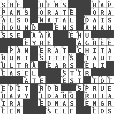ACROSS 1. A female animal or person 4. Cub Scout units 8. Reproach for some lapse or misdeed 11. Baking dishes 13. Declaim 15. Mouth or opening 16. In addition 17. Brizilian seaport 18. Raised platform 19. Having a circular shape 21. Followers of ems 22. Nanny 23. Compass dir. 24. Auto club (abbr.) 27. Australian flightless bird 29. Jane of fiction 30. Match 34. Baking dish 36. Part of Q.E.F. 39. Riviera of "Kiss of the Spider Woman" 40. Undersized animal 41. Settings 43. Strained 44. Extremist 46. Hearing organs 47. Connecticut Ivy Leaguer 48. Artist's stand 49. Move through with a circular motion 51. Had dinner 53. Eastern Standard Time (abbr.) 54. Small child 57. Prepare for publication 60. Director Reiner 63. Disorder 65. _ Jones' Locker 66. Potato state 69. Round or rotation of duties 70. Retirement account (abbr.) 71. Ferber et al. 72. Engineer (abbr.) 73. Car or cant ending 74. Oneself 75. Greek goddess of the dawn DOWN 1. Practice fights 2. Auras 3. Take place subsequently 4. Spanish title 5. Epoch 6. Nathan's nickname 7. Comedian Laurel of Laurel & Hardy 8. Wander aimlessly 9. Roberta Peters solo 10. Romantic infatuation 12. Boy, to dad 14. Otherwise 18. Female offspring 20. 24 hours 25. Ancient Greek god of war 26. Nest on high 28. Apple computer (short form) 29. Plea 31. Monetary unit of Yemen 32. Needle holder 33. Consume 34. Monetary unit of Botswana 35. Pismires 37. "One Day ___ Time" 38. Laconic 40. Sorrow 42. Fast planes 45. Keyboard modifier key 50. ___ a Wonderful Life 52. One of the Great Lakes 54. Marketplace scale 55. Money paid out 56. Pulls into pieces 57. Singer Brickell 58. Have the gumption 59. _ the terrible 61. Probability 62. Object of repulsion 64. Before (prefix) 67. Actor Linden 68. Order of Saint Francis (abbr.)