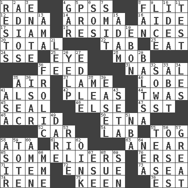 ACROSS 1. Actress Charlotte 4. Global Positioning Systems (abbr.) 8. Secret move to avoid paying debts 12. Pulitzer Prize-winning author Ferber 14. Odor 16. Helper 17. Thailand, formerly 18. Homes 20. "_____ Recall" 22. Bar bill 23. Consume 24. Compass dir. 25. Sight organ 28. Disorderly crowd 30. Nourish 31. Relating to the nose 35. Atmosphere 37. Unable to walk 40. Ear part 41. In addition 42. Entreaties 44. It was, poetically 45. Lick closed 46. Otherwise 47. Fast jet (abbr.) 48. Bitter 50. Inactive volcano in Sicily 52. Auto 54. Experiment locale 55. Coat; cloak 58. _ moment's notice (2 wds.) 61. River (Sp.) 63. Approach 65. Wine waiters 70. Celtic language 71. A whole individual unit 72. Take place subsequently 73. Toward the sea 74. French philosopher Descartes 75. Peachy ____! 76. Eastern Standard Time (abbr.) DOWN 1. Musical pauses 2. Goodbye (Sp.) 3. Maternal 4. Slender fish 5. Before (prefix) 6. Distress signal 7. Stricken, poetically 8. Avid follower 9. Louse (plural) 10. It may be bright or harebrained 11. Trial 13. Nursemaid (var.) 15. First man 19. Inky black, to poets 21. Area sheltered from the wind 26. Sharp bark 27. Peak District village in England 29. Greek mezzo-soprano Agnes 30. Play 32. Sty mamas 33. Blind as ____ 34. French article 35. Actor Baldwin 36. Austrian river, tributary to the Danube 38. Cartoonist voice _ Blanc 39. Artist's stand 41. White ___ sheet 43. Bristle 49. Have the gumption 51. Basketball assoc. 53. Cause heat under the collar 55. Laconic 56. Fertile tracts in a desert 57. Relatively large 58. SW Saudi Arabia district 59. Haul 60. So be it 62. Pig sound 64. Teachers' org. 66. Madame (abbr.) 67. Compass dir. 68. Sorrow 69. Elected rep.