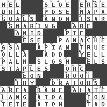 ACROSS 1. Cartoonist voice _ Blanc 4. _ gin 8. Celtic language 12. RI univ. 13. Introduce or present, as a question 14. California wine valley 15. Purposes of endeavors 18. At once, immediately (arch.) 19. Russian ruler of old 20. Catching in a trap 22. "We ___ not amused" (Victoria) 23. Among 24. Sliced dessert 25. Compass dir. 26. Flamboyance 30. Girls' org. (abbr.) 33. Bee-related 36. Loyal 37. Water jar 39. Find the sum of 40. Shout 41. Inside of hand 42. Make a splashing sound 44. Raised railways 45. Paper fasteners 47. The grampus (Milton) 50. A really long time 51. Carrot, for example 53. Attempt to accomplish something 54. Speakers 57. Type of rug 59. Object of repulsion 61. Having winglike extensions 63. Austrian-born American filmmaker Fritz 64. Opera by Verdi 65. Electrically charged atom 66. Wig 67. Smallest unit of an element 68. Small amount or degree DOWN 1. Java container 2. Greek god of love 3. Woody, climbing, usually tropical plant 4. Connect, as a bridge 5. Protracted 6. Bear (Spanish) 7. Car or cant ending 8. Plea 9. Raze (variant) 10. Health resort 11. Hearing organ 16. Unable to walk 17. Indian titles of respect 21. It may be bright or harebrained 22. The 18th letter of the Arabic alphabet 24. Baking dish 26. Groovy apts. 27. Algonquian 28. Frame or body of a ship 29. Snakelike fish 30. Republicans 31. Narrow board 32. Silent film actress Nazimova 34. Friends 35. Wedding promise 38. Electrical Measurement 42. Elected rep. 43. Israeli folk dance 46. Myrna of the movies 48. Round or rotation of duties 49. Calm and collected 52. Distinguishing feature 53. Portable shelter 54. Southwest Nigerian state 55. 480, 500 or 516 sheets of paper 56. Portico 57. Keyboard modifier key 58. Actress Charlotte 59. Sound made by sheep 60. Small island 62. Conclusion
