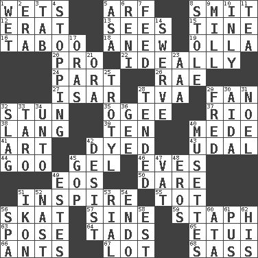 ACROSS 1. Soaks 5. Sandy's bark 8. Stricken, poetically 12. Part of Q.E.F. 13. Observes 15. Prong on a fork 16. Off limits 18. Afresh 19. Rounded earthenware pot or jar 20. Adept person 22. Under perfect conditions 24. Role in a play 26. Actress Charlotte 27. Austrian river, tributary to the Danube 28. Federal power corp. 29. Air blower 32. Make senseless or dizzy 35. Double curve, resembling the letter S 37. River (Sp.) 38. Austrian-born American filmmaker Fritz 39. "___ Little Indians" 40. Ancient Persian 41. Nonscientific branch of learning 42. Colored 43. Freehold land 44. Thick or sticky substance 45. Set 46. Nights before holidays 49. Greek goddess of the dawn 50. Have the gumption 51. Motivate 55. Small child 56. Three-handed card game 57. Trig term 59. Staphylococcus 63. Airs 64. Bits 65. Needle case 66. Pismires 67. Car dealer's back yard 68. Backtalk DOWN 1. Dripping 2. Period 3. Keyboard key 4. Ceasing 5. White ___ sheet 6. Painter Guido (1575-1642) 7. Nourish 8. Took without asking 9. Place where flour is made 10. In an inward manner 11. Beverage made from leaves 14. Turn aside suddenly 17. Mouths or openings 21. Mouth or opening 23. American Automobile Association (abbr.) 25. Trinitrotoluene 28. Watched over 29. Flintstone 30. Opera by Verdi 31. Christmas carol 32. Volcanic refuse 33. Edible starchy tuberous root 34. To (old English) 36. Unit of force equal to gravity 40. French bagpipes 42. Cease 45. Republican Party 47. Large container 48. Greek god of love 49. _____ Park, CO 51. Image 52. Political cartoonist Thomas 53. Monetary unit of Yemen 54. Inside; within (prefix) 56. Health resort 58. Eastern Standard Time (abbr.) 60. _ moment's notice (2 wds.) 61. Tenth month of the Hindu calendar 62. Part of HMS, perhaps
