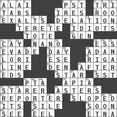 ACROSS 1. Jai _ 5. Pacific Standard Time (abbr.) 8. Three (prefix) 11. Bar bills 12. Angers 13. Friend of Pooh 14. Honors 17. Conveyance 19. Cylindrical with tapered ends 21. Foolish or stupid persons 22. Haul 23. Commissioned mil. rank 24. Island 27. Billionth: prefix 29. Double-curved letter 32. Elude 34. 24 hours 36. First of billions? 37. Australian parrot (variant) 38. Compass dir. 39. Port city in Latvia 40. Actor's bit 41. Lair 42. Following 43. Begley and Asner 44. Play the lead 46. Fast jet (abbr.) 47. Parent Teacher Association (abbr.) 50. Capital of Western Samoa 52. A viewer who gazes fixedly 55. Michaelmas daisies 57. News announcer 59. Slanted 62. It is 63. Filth; sediment 64. Within a short period 65. Observe 66. Snakelike fish 67. Inactive volcano in Sicily DOWN 1. Had dinner 2. Not strict 3. Blind as ____ 4. Small island 5. Before (prefix) 6. Major League Baseball Commissioner Bud 7. Sadhe (variant) 8. Musical group of three 9. Carrot, for example 10. Charged atoms 12. Binary compound 15. Marketplace scale 16. Stalk of a moss capsule 18. Shallow baking pan 20. Looked after 24. Cell (Danish) 25. Stay clear from 26. Tall tales 28. Fertile tracts in a desert 29. Prepares for publication 30. Gurus 31. Don Adams' spy role 33. Expire 35. Gossips 36. Sandy's bark 42. Satellite of Uranus 45. Flats, for short 47. Adept person 48. Laconic 49. Nick name for Arthur 51. Came up 52. Indian titles of respect 53. False hair 54. Domed church section 55. "We ___ not amused" (Victoria) 56. Blemish 58. Pipe bend 60. A really long time 61. Heredity factor (abbr.)