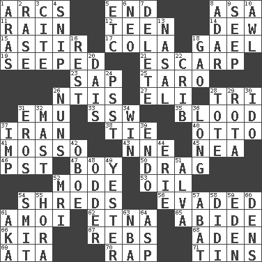 ACROSS 1. Curves 5. Conclude 8. White ___ sheet 11. Water falling in drops from the sky 12. Adolescent 14. Morning condensation 15. Being in motion 17. Root beer relative 18. Highlander 19. Oozed 21. Fortification 23. Plant excrement 25. Pacific island yam 26. Nuclear Threat Initiatives 27. Biblical high priest 28. Three (prefix) 31. Australian flightless bird 33. Compass dir. 35. Vital fluid 37. SW Asia republic 38. Make a knot 40. Von Bismarck 41. With motion or animation 43. Compass dir. 45. Teachers' org. 46. Pacific Standard Time (abbr.) 47. Male child 50. To draw with force 52. Method 53. Lubricate 54. Tears up 56. Dodged 61. Mine, in Marseilles 62. Inactive volcano in Sicily 65. Remain 66. Apertif with cassis 67. Confederate soldiers (slang) 68. Arabian gulf 69. "One Day ___ Time" 70. Reproach for some lapse or misdeed 71. Canisters DOWN 1. Ancient river in northeast Turkey 2. Raze (variant) 3. Quote 4. Clip 5. And so on (abbr.) 6. Modern: prefix 7. Erase 8. The sixth month of the Jewish calendar 9. Ooze 10. Leather borer 13. Rhinal 16. Relief 18. E Mali city 20. Raised platform 22. Baby bed with high sides 24. Inconspicuous attention getter 26. Religious women 28. Carryall 29. Roll call or roster of names 30. Wedding promise 31. Greek god of love 32. Vertical spar for supporting sails 34. Acquire through effort 36. Having great length 37. Mischievous child 39. Inside; within (prefix) 42. Mitch Miller's instrument 44. 4th largest of the Great Lakes 48. More peculiar 49. Of or pertaining to yesterday 51. Inventor's middle name 52. Medical imaging device (abbr.) 54. Stricken, poetically 55. Israeli folk dance 57. Blind as ____ 58. "You Light Up My Life" star Conn 59. Paradise 60. Habitations of wild animals 61. Alias (abbr.) 63. Basketball assoc. 64. Viper