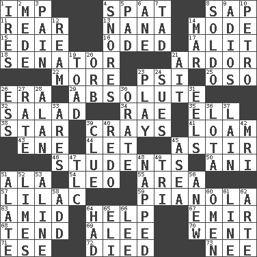 ACROSS 1. Naughty child 4. Petty quarrel 8. Plant excrement 11. Located in or toward the back 13. Grandmother 14. Method 15. Singer Brickell 16. Wrote a lyric poem 17. Came down and settled, as after flight 18. Elected representative 21. Zeal 22. Greater amount 23. Air pressure measure (abbr.) 25. Bear (Spanish) 26. Epoch 29. Utter; complete 32. Vegetable dish 34. Actress Charlotte 35. Pipe bend 38. Play the lead 39. Trading vessels 41. Rich soil 43. Compass dir. 44. Allow 45. Moving or stirring 46. SAT takers 50. Cuckoo 51. Insect wing 54. Lion 55. Type of rug 57. Pale purple color 59. Player piano 63. Among 64. Aid 67. Arab leader 68. Be inclined (to) 69. Toward shelter 70. Gone 71. Compass dir. 72. Passed on 73. Born DOWN 1. Angers 2. Ancient Persian 3. Ache 4. Sounds asleep 5. Writing tablet 6. A saturated hydrocarbon 7. Bit 8. Twentieth part of a lira 9. Goodbye (Sp.) 10. Stone: prefix 12. 480, 500 or 516 sheets of paper 14. Spoil 19. Frog relative 20. Globe 21. Small island 23. Shaw product 24. Takes to court 26. Curvy letter 27. Assign a rank or rating to 28. ____ Jay Lerner 30. Declaim 31. Snakelike fish 33. Ancient Greek god of war 36. Globular water bottle used in Asia 37. (Had) reclined 39. A slight indication 40. Redecorate 42. Medical imaging device (abbr.) 45. Toward the sea 47. Affectionate concern, for short 48. Slept 49. Three (prefix) 51. Having winglike extensions 52. Citrus fruits 53. Place in a line 56. Afresh 58. Find the sum of 60. Sign of things to come 61. Actor's bit 62. Johnson of "Laugh-In" 64. Possessed 65. Biblical high priest 66. Area sheltered from the wind