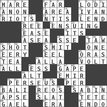 ACROSS 1. Female horse 5. Distant 8. Farming town in central California 12. Soon (poet.) 13. Length times width 15. _ the terrible 16. Disturbances 18. Nuclear Threat Initiatives 19. Grant temporary use of 20. Portuguese money of account (variant) 22. Following as a consequence or result 24. Relaxation 26. ___ a Wonderful Life 27. At sea 28. Compass dir. 29. The 23rd letter of the Hebrew alphabet 32. Guess 35. Stricken, poetically 37. Single 38. Suggestive of the supernatural 39. Snakelike fish 40. Mouths or openings 41. Beverage made from leaves 42. Silent film actress Nazimova 43. Electrical Unit 44. 100% 45. Double-curved letter 46. Yawn 49. Keyboard modifier key 50. Independent ruler or chieftain 51. Son of Zeus who helped slay Medusa 55. For each 56. Indonesian resort city 57. Vintage cars 59. Unit of acoustic absorption 63. Domed church section 64. Narrow board 65. Wig 66. Highlander 67. Period 68. Inside; within (prefix) DOWN 1. Third mo. 2. Black tropical American cuckoo 3. Friend of Pooh 4. Plea 5. Air blower 6. Johnson of "Laugh-In" 7. It's straight from the horse's mouth 8. Ms. Damita and namesakes 9. Baking chamber 10. Mild oath, euphamism for damn 11. Indiana (abbr.) 14. Aid 17. Oceans 21. Compass dir. 23. Shoshoni 25. Artist's stands 28. Fodder prepared in a silo 29. "Corrida" creature 30. Of or related to the anus 31. Compass direction 32. Bristle 33. Person who is morally reprehensible 34. Taken by mouth 36. Cartoonist voice _ Blanc 40. Make much ado about nothing 42. Michaelmas daisies 45. Raised railways 47. Electrical Unit 48. Sliced desserts 49. Satellite of Uranus 51. Dad 52. Otherwise 53. Ubangi River tributary 54. Fly high 56. Container for groceries 58. R.R. building 60. Benjamin's nick name 61. It would 62. Modern: prefix