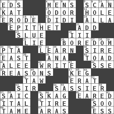 ACROSS 1. Begley and Asner 4. Not women's 8. Examine hastily 12. Krazy ___ of comics 13. Scent 14. Hollow 15. Eat (away) 18. "You Light Up My Life" star Conn 19. Silent film actress Nazimova 20. Curse 22. Increase 23. Turn sharply 24. One more than two 25. Untruth 26. Mood resulting from idleness 30. Parent Teacher Association (abbr.) 33. Acquire or gain knowledge or skills 36. Father 37. 90 degrees 39. Santa ___, CA 40. Frog relative 41. Toward shelter 42. Compose 44. Compass dir. 45. Thinks logically 47. Barrel 50. The 23rd letter of the Hebrew alphabet 51. Part of Q.E.F. 53. Title for a knight 54. More disrespectful 57. Ketch in the Levant 59. Heroin 61. Having ears or earlike features 63. Slanted text style (abbr.) 64. Hoop that covers a wheel 65. "Barney Miller" actor Jack 66. Docile 67. Ancient river in northeast Turkey 68. Double-curved letter DOWN 1. Supplement with great effort 2. Have the gumption 3. Obstructs or blocks passage 4. Method 5. Prepare for publication 6. Dreamland 7. Indian title of respect (Mr.) 8. Most dark, concealed or hidden 9. Chilled 10. Everything 11. Teachers' org. 16. Deli pickle 17. Needle case 21. The bottom of a shoe or boot 22. Wind 24. Electrically charged atom 26. Naughty child 27. "Vaya con ____" 28. Mouths or openings 29. Ancient Persian 30. Lightbulb-shaped fruit 31. Falsehood 32. At sea 34. Hearing organs 35. Black tropical American cuckoo 38. A testis 42. Compass dir. 43. Makes supply last 46. Rowing implement 48. Celtic language 49. Greek goddess of the earth (variant) 52. Laconic 53. Thailand, formerly 54. "Two Mules for Sister ____" 55. Grows older 56. Vintage cars 57. Be seated 58. _ moment's notice (2 wds.) 59. R.R. building 60. Apertif with cassis 62. Two (Sp.)