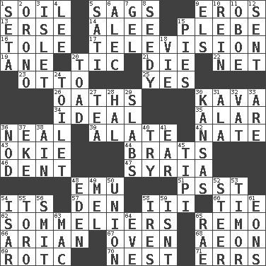 ACROSS 1. Earth 5. Settles 9. Greek god of love 13. Celtic language 14. Toward shelter 15. First-year military academy student 16. Lacquered or enameled metalware 17. Boob tube 19. One (Scot) 20. Nervous spasm 21. Expire 22. Fish or hair follower 23. "Beetle Bailey" pooch 25. It is so 26. Expletives 30. Polynesian shrub of the pepper family 34. Perfect 35. Having or resembling wings 36. Be tempered by heat 39. Having winglike extensions 42. Nathan's nickname 43. Migrant worker of the '30s 44. Naughty children 46. Scratch 47. Damascus' land 48. Australian flightless bird 51. Inconspicuous attention getter 54. It is 57. Lair 58. One more than two 60. Neckwear 62. Wine waiters 65. San ____ (Riviera town) 66. Believer in; advocate of (suffix) 67. Baking chamber 68. Age 69. College mil. group 70. Egg locale 71. Blunders DOWN 1. Stalk of a moss capsule 2. U. of Maine site 3. Small island 4. Area sheltered from the wind 5. Suttee (variant) 6. Actor Baldwin 7. Set 8. Sleazy 9. Raised railways 10. It's straight from the horse's mouth 11. Mitch Miller's instrument 12. Emitted 15. Sliced desserts 18. Compete 20. Frog relative 24. Rest room 27. Afternoon social gathering 28. Actor Linden 29. Broad, flat, thick pieces 30. Sunflower state 31. Wing 32. Large container 33. "We ___ not amused" (Victoria) 36. Dreamland 37. Supplement with great effort 38. The 18th letter of the Arabic alphabet 40. Attempt 41. Ewer handle 45. Native american tent (variation) 48. Genesis locale 49. Cartoonist voice _ Blanc 50. The state of being joined or united 52. Guide 53. Southeast Indonesia island 54. Austrian river, tributary to the Danube 55. "Corrida" creature 56. Stricken, poetically 58. Angers 59. Is not 61. Immeasurably long periods of time 63. Apple computer (short form) 64. First lady 65. Actress Charlotte
