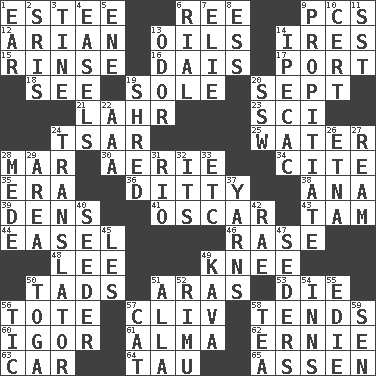 ACROSS 1. First name in cosmetics 6. To separate or throw off 9. Personal Computers (abbr.) 12. Believer in; advocate of (suffix) 13. Lubricates 14. Angers 15. Remove soap 16. Raised platform 17. Left side of a ship or aircraft 18. Perceive with the eye 19. Not divided or shared with others 20. Back-to-school mo. 21. Cowardly lion portrayer 23. _-fi 24. Russian ruler of old 25. Wetness 28. Spoil 30. Nest on high 34. Quote 35. Epoch 36. Simple song 38. Santa ___, CA 39. Cub Scout units 41. Witty Wilde 43. Scottish cap 44. Artist's stand 46. Raze (variant) 48. Area sheltered from the wind 49. Leg joint 50. Bits 51. Caspian sea tributary 53. Pass on 56. Carry 57. 154 in Roman numerals 58. Looks after 60. Russian composer Stravinsky 61. _ mater 62. Bert's buddy 63. Automobile 64. The 19th letter of the Greek alphabet 65. NE Netherlands city DOWN 1. Ewer handle 2. Indian titles of respect 3. Prong on a fork 4. Artist's stands 5. Compass dir. 6. Monetary unit of Yemen 7. Writer Wiesel 8. Curvy letter 9. Conciliate 10. Foregone conclusion 11. Fast jet (abbr.) 13. Scent 14. Medicinal drug used to evoke vomiting 19. Fragment 20. Compass dir. 22. Auto club (abbr.) 24. Interpreter 26. Inactive volcano in Sicily 27. 480, 500 or 516 sheets of paper 28. Ancient Persian 29. Type of rug 31. _ de Janeiro 32. ___ a Wonderful Life 33. And so on (abbr.) 37. Entertaining tales 40. Sowing specialist 42. Actress Charlotte 45. French article 47. Spring feasts 49. Polynesian shrub of the pepper family 50. Ancient Roman robe 51. Silent film actress Nazimova 52. Tall New Zealand timber tree 54. Restaurants 55. Singer Brickell 56. Nervous spasm 57. Feline 58. Beverage made from leaves 59. Elected rep.