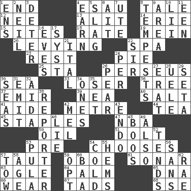 ACROSS 1. Conclude 4. Son of Isaac 8. Falsehood 12. Born 13. Set down 14. 4th largest of the Great Lakes 15. Settings 18. Pace 19. Count _ (2 wds.) 20. Imposing or collecting, as a tax 22. Health resort 23. Remainder 24. Sliced dessert 25. R.R. building 26. Son of Zeus who helped slay Medusa 30. Ocean 33. Failure 36. Woody plant 37. Arab leader 39. Teachers' org. 40. Table seasoning 41. Helper 42. Distance measurement (Brit.) 44. Afternoon social gathering 45. Paper fasteners 47. Basketball assoc. 50. Lubricate 51. Stupid person 53. Before (prefix) 54. Opts 57. Strained 59. Mitch Miller's instrument 61. Underwater navigation system 63. Stare at amorously 64. Inside of hand 65. Heredity factor (abbr.) 66. Put on (as clothing) 67. Bits 68. Compass dir. DOWN 1. Followers of ems 2. Famous astronaut Armstrong 3. Prevent from occurring 4. Merit 5. Volcanic refuse 6. Small island 7. Shoshoni 8. Storms 9. Length times width 10. Cards in a Roman deck? 11. Car or cant ending 16. Nights before holidays 17. System (abbr.) 21. Slanted text style (abbr.) 22. Title for a knight 24. For each 26. Lightbulb-shaped fruit 27. Part of Q.E.F. 28. Ubangi River tributary 29. Bristle 30. Oceans 31. Send forth 32. Opera by Verdi 34. Singles 35. Put into a specified state 38. Newsperson 42. Cartoonist voice _ Blanc 43. Inside; within (prefix) 46. Whopper 48. Expressions of contempt or scorn 49. In addition 52. Is inclined (to) 53. Monetary unit of Botswana 54. Having a low temperature 55. Equivocates 56. Without 57. Pull behind 58. Personal question 59. Elect 60. Sound made by sheep 62. Actress Charlotte