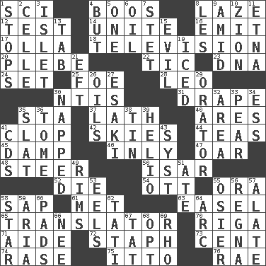 ACROSS 1. _-fi 4. Scornful sounds 8. Goldbrick 12. Trial 14. Join together 16. Give off 17. Rounded earthenware pot or jar 18. Boob tube 20. Military trainee 22. Nervous spasm 23. Heredity factor (abbr.) 24. Put into a specified state 25. Enemy 28. Lion 30. Nuclear Threat Initiatives 31. Window treatment 35. R.R. building 37. Thin strip of wood or metal 40. Ancient Greek god of war 41. Hoof sound 42. Atmospheres 44. Beverages made from leaves 45. Moist 46. In an inward manner 47. Boat paddle 48. Guide 50. Austrian river, tributary to the Danube 52. Pass on 54. Baseball player Mel 55. Mouth or opening 58. Plant excrement 61. Was introduced to 63. Artist's stand 65. Interpreter 70. Capital of Latvia 71. Helper 72. Staphylococcus 73. Penny 74. To erase 75. "Tell ____ the Marines!" 76. Actress Charlotte DOWN 1. Obstructs or blocks passage 2. Cell (Danish) 3. Small island 4. Yet 5. Single 6. Lubricate 7. Proofreading order 8. French article 9. Among 10. The Jewish people; Israel 11. Inactive volcano in Sicily 13. Keyboard key 15. Tending to cause great harm 19. On the rocks 21. Bank Draft (abbr.) 26. Lubricates 27. 1973 Nobel Price Winner (Physics) Leo 29. Speaker 30. Slept 32. Type of rug 33. Lightbulb-shaped fruit 34. Curvy letter 35. Narrow board 36. Heavy book 38. Shallow baking pan 39. Sun: prefix 41. Music discs 43. System (abbr.) 49. Basketball hoops 51. Had dinner 53. Snakelike fish 55. Flexible twig of a willow tree 56. Rain (Swedish) 57. Having winglike extensions 58. Play the lead 59. Roberta Peters solo 60. Groovy apts. 62. Jacques of French films 64. Curve 66. Born 67. Make lace 68. Choose 69. 17th letter of the Greek alphabet