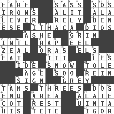 ACROSS 1. Conductor's collection 5. Backtalk 9. Distress signal 12. Removes the wrinkles 14. Came down and settled, as after flight 15. Chicken ___ king 16. Crowbar 17. Have trust in 18. Benjamin's nick name 19. Compass dir. 20. New York city 23. "Vaya con ____" 24. American tennis player Robert 25. Amused look 27. International (abbr.) 30. Hit sharply and swiftly 32. Snakelike fish 33. Ardor 34. Mouths or openings 36. Raised railways 38. Consume 39. Teat (slang) 40. French article 43. Binary compound 46. Overwhelm 48. Lacquered or enameled metalware 49. Mature 51. "Barney Miller" actor Jack 52. It's straight from the horse's mouth 53. Public display of a written message 54. Jennifer or Joel 56. Scottish caps 58. Trios 61. Two (Sp.) 64. Australian flightless bird 65. Length times width 66. Having winglike extensions 68. Small bed 69. State of inaction 70. National forest in Provo, Utah 71. Part of HMS, perhaps 72. Wig 73. Russian composer Stravinsky DOWN 1. Do some clerical work 2. Ancient Greek god of war 3. Be footloose 4. Compass dir. 5. "Two Mules for Sister ____" 6. Actor Baldwin 7. Fodder prepared in a silo 8. Filthy place 9. Unit of acoustic absorption 10. Margarine 11. Without 13. Indian titles of respect 21. Through, poetically 22. Centers of feelings and intuitions 23. Deli pickle 24. 100% 26. To separate or throw off 27. Ending with capital 28. Teachers' org. 29. Jacques of French films 31. Aches 35. Moe Howard, for one 37. A type of plum 41. Biblical high priest 42. Elected rep. 44. Raised platform 45. Ovum 47. Had on 48. Attempt to accomplish something 50. Main course 53. Particles of soot 55. He sold his birthright 56. Georgia ____ (Atlanta school) 57. Mine, in Marseilles 59. Behest 60. Assign a rank or rating to 61. Mild oath, euphamism for damn 62. "Beetle Bailey" pooch 63. Scorch 65. Nonscientific branch of learning 67. Cards in a Roman deck?