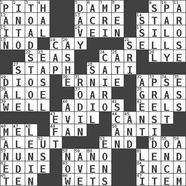 ACROSS 1. Essential or central part 5. Moist 9. Health resort 12. Small Philippine buffalo 13. Land measure 14. Play the lead 15. Slanted text style (abbr.) 16. Distinctive style or manner 17. Grain storage tower 18. Lower and raise head in agreement 19. Island 21. Makes a sale 22. Oceans 24. Automobile 26. Sodium hydroxide 27. Staphylococcus 28. Suttee (variant) 29. "Vaya con ____" 30. Bert's buddy 32. Domed church section 36. _ vera 37. Boat paddle 38. Pate de foie ____ 39. Water source 40. Goodbye (Sp.) 42. Snakelike fish 43. Tending to cause great harm 44. 2nd pers. sing. pres. of can (arch.) 46. Cartoonist voice _ Blanc 49. Air blower 50. Against 51. Native American of Southwest Alaska 53. Conclusion 54. ___ good deed 57. Religious women 58. Billionth: prefix 61. Grant temporary use of 62. Singer Brickell 63. Baking chamber 64. South American Indian 65. "___ Little Indians" 66. Moistens 67. Detail DOWN 1. Ache 2. To the inside or interior of 3. Inedible or poisonous agaric 4. Actor Linden 5. American folk hero Crockett 6. Adept person 7. Medical imaging device (abbr.) 8. Animal enclosure 9. Free from disturbance or agitation 10. Friendly 11. Came up 14. Compass dir. 19. Head covering 20. American tennis player Robert 21. _ Lanka 23. Artist's stand 24. Capital of Egypt 25. Had dinner 27. Filth; sediment 28. Slow-paced one 29. Fool 31. "The Thinker" sculptor 32. Representative 33. Elected leader of a country 34. Table seasoning 35. Curvy letter 40. Actress Gardner 41. Examine hastily 43. Bank Draft (abbr.) 45. Also 46. French painter Edouard 47. Dodge 48. Soviet premier 1918-24 52. Purpose 53. Immeasurably long periods of time 55. Single time 56. First of billions? 58. At this time 59. "___ Maria" 60. Fish or hair follower 61. Cards in a Roman deck?