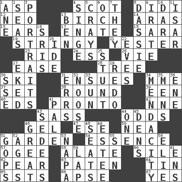 ACROSS 1. Cleo's killer 4. Highlander 8. "You Light Up My Life" star Conn 12. Modern: prefix 13. A tree used for making furniture 14. Caspian sea tributary 15. Hearing organs 17. Maternal 18. "Two Mules for Sister ____" 19. Slender, wiry 21. Of or pertaining to yesterday 23. To free from 24. Curvy letter 26. Compete 27. Comfort 28. Relationship diagram 30. What Jean-Claude Killy likes to do 31. Takes place subsequently 34. Madame (abbr.) 37. Arrange properly for use 38. Having a circular shape 39. Car or cant ending 40. Begley and Asner 41. Right away 42. Compass dir. 43. Backtalk 44. Probability 46. Set 47. Compass dir. 50. Teachers' org. 51. Place where plants grow 54. Substance 57. Double curve, resembling the letter S 58. Having winglike extensions 60. Filth; sediment 62. Lightbulb-shaped fruit 63. Eucharist need 64. Shallow baking pan 65. Fast planes 66. Domed church section 67. It is so DOWN 1. One (Scot) 2. Oceans 3. Likenesses of persons 4. Scorch 5. Trading vessels 6. Sep. follower 7. Those things 8. Small ungulate mammals of Africa 9. Feeling or showing extreme anger 10. Have the gumption 11. Austrian river, tributary to the Danube 13. Benjamin's nick name 16. Indian titles of respect 20. Binary compound 22. Nights before holidays 25. Difficult or unusual or dangerous feat 27. Supplemented with great effort 29. Do over again 30. Compass dir. 31. Blunders 32. Trap for birds or small mammals 33. Player for Phoenix 34. Ananias' fault 35. Not women's 36. Compass dir. 41. Diluted with white 43. Spring feasts 44. Single 45. Lairs 46. Relatively large 48. Theater features 49. First name in cosmetics 51. Republicans 52. Eons 53. California wine valley 55. Elected rep. 56. Writer Wiesel 59. Pet locale 61. Followers of ems