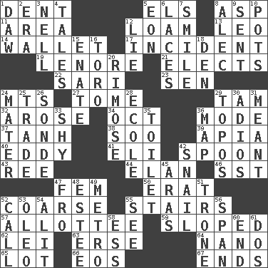 ACROSS 1. Scratch 5. Raised railways 8. Viper 11. Type of rug 12. Rich soil 13. Lion 14. Place for singles 17. Happening 19. Poe poem 21. Opts 22. Indian skirt 23. Elected rep. 24. Mountains (abbr.) 27. Heavy book 29. Scottish cap 32. Came up 34. Sep. follower 36. Method 37. Hyperbolic tangent 38. "Barney Miller" actor Jack 39. Capital of Western Samoa 40. Whirlpool 41. Biblical high priest 42. Soup utensil 43. To separate or throw off 44. Enthusiasm 46. Fast jet (abbr.) 47. Opposite of masc. 50. Part of Q.E.F. 52. Rough 55. Flight of steps 57. One to whom something is allotted 59. Had an oblique or slanted direction 62. Flowery wreath 63. Celtic language 64. Billionth: prefix 65. Car dealer's back yard 66. Greek goddess of the dawn 67. Conclusions DOWN 1. Obsolete 2. Period 3. 1994 drama film starring Jodie Foster 4. Stories 5. A really long time 6. Shoestrings 7. Grin 8. Actor Baldwin 9. Emitted 10. Cooking vessels 12. Falsehood 15. Related on the mother's side 16. "Corrida" creature 18. Lair 20. Full of chinks, cracks, or crevices 24. Mother 25. Barter 26. Message 28. Learning spot: Fr. 29. Literary convention 30. Goodbye (Sp.) 31. Intended 33. Like a shrinking violet 35. Bathroom plumbing fixture 36. Atlas unit 42. Slow-paced one 45. Caspian sea tributary 47. Back 48. First name in cosmetics 49. Paris' subway 51. Marketplace scale 52. Give a ring to 53. Margarine 54. Set down 55. Observe 56. Connect, as a bridge 58. Double-curved letter 60. Conclusion 61. Two (Sp.)