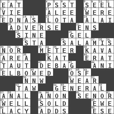 ACROSS 1. Erode 4. Inconspicuous attention getter 8. Sew up the eyelids of hawks and falcons 12. Compete 13. Toward shelter 14. Past tense of be (plural) 15. Ferber et al. 18. Globular water bottle used in Asia 19. Jai ____ 20. Contrary to your interests or welfare 22. Followers of ems 23. Trig term 24. Set 25. R.R. building 26. Deli grouping 30. Not either 33. Distance measurement 36. Polynesian shrub of the pepper family 37. Type of rug 39. Krazy ___ of comics 40. Part of Q.E.F. 41. Strained 42. Debunk (Brit. slang) 44. Cuckoo 45. Shoved, as through a crowd 47. Order of Saint Francis (abbr.) 50. Compass dir. 51. Erode 53. The 23rd letter of the Hebrew alphabet 54. Commissioned military rank 57. Of or related to the anus 59. At once, immediately (arch.) 61. Sir (Sp.) 63. Water source 64. Exchanged or delivered for money 65. She-sheep 66. Made of lace 67. Sums up 68. Compass dir. DOWN 1. Night before a holiday 2. Opera by Verdi 3. Watches over 4. Friends 5. _ gin 6. Put into a specified state 7. Beverage made from leaves 8. Tchaikovsky ballet 9. Snakelike fish 10. Epoch 11. Flowery wreath 16. Advice 17. Emitted 21. 480, 500 or 516 sheets of paper 22. Snakelike fish 24. Slender fish 26. Bristle 27. Hindu Mythology: god of death 28. _ the terrible 29. Suttee (variant) 30. Nathan's nickname 31. Spoken 32. Reuben's nickname 34. Supplemented with great effort 35. Keyboard key 38. Without tonality 42. Morning condensation 43. Long dress 46. Compass dir. 48. Observes 49. Conductor's collection 52. Indian princess (variant) 53. Baby powder 54. Aureate 55. Conclusions 56. Moos 57. Leather borer 58. Teachers' org. 59. White ___ sheet 60. Allow head to fall sleepily 62. To separate or throw off