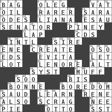ACROSS 1. Container for groceries 4. Cassini of fashion 8. Large container 11. Petroleum 12. Less widely known 14. "Two Mules for Sister ____" 15. Lyric poems 17. Climbing, woody, usually tropical vines 18. He sold his birthright 19. Elected representative 21. Abounding in pines 23. Pet locale 24. Music discs 25. International (abbr.) 27. Beget 30. Compass dir. 31. Make 34. Bear (Spanish) 37. Begley and Asner 38. Webber/Rice musical 39. Allow 40. Car dealer's back yard 41. Poe poem 43. Keyboard modifier key 44. System (abbr.) 45. Perform or handle clumsily 47. "Barney Miller" actor Jack 49. Twice 50. Child's nurse 52. Mood resulting from idleness 56. Saudi Arabian king (1953-1964) 57. Acquire or gain knowledge or skills 60. French philosopher Descartes 61. In addition 62. Strangle with an iron collar 63. Born 64. Sliced dessert 65. Von Bismarck 66. Fast jet (abbr.) DOWN 1. Scornful sounds 2. Assistant 3. Small, secluded valley 4. Lowest deck of a ship 5. Den 6. Epoch 7. Commissioned military rank (abbr.) 8. Flower holders 9. Like ___ of sunshine 10. The 19th letter of the Greek alphabet 13. Hit sharply and swiftly 14. Post 16. Table seasoning 20. Baby powder 22. Frozen water 25. _ china 26. Egg locale 27. Inhabitant of Heaven 28. "Tell ____ the Marines!" 29. Stern 30. Snakelike fish 32. Have trust in 33. Nights before holidays 34. Norwegian king 35. Itself 36. Baseball player Mel 42. Independent ruler or chieftain 44. Boy, to dad 46. One who uses or employs something 47. Lush 48. Southwest Nigerian state 49. Beat drum 50. Indonesian resort city 51. Raised railways 52. Naughty child 53. Lairs 54. Washington bills 55. Confront 56. Plant excrement 58. Environmental prefix 59. Tate display