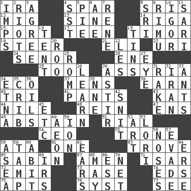 ACROSS 1. Lyricist Gershwin 4. Coast Guard woman 8. Indian titles of respect 12. Russian fighter aircraft 13. Trig term 14. Capital of Latvia 15. Sweet dark-red dessert wine 17. Adolescent 18. Southeast Indonesia island 19. Navigate 21. Biblical high priest 23. RI univ. 24. Sir (Sp.) 26. Compass dir. 28. Utensil 30. Nineveh was its capital 34. Environmental prefix 37. Not women's 39. Merit 40. Three (prefix) 41. Leg coverings 43. Krazy ___ of comics 44. Mediterranean tributary 46. It's straight from the horse's mouth 47. Followers of ems 48. Refrain by choice 51. Monetary unit of Yemen 54. Corporate head (abbr.) 55. Marketplace scale 58. _ moment's notice (2 wds.) 61. Single 63. Collection of objects 65. Unit of acoustic absorption 67. So be it 71. Austrian river, tributary to the Danube 72. Arab leader 73. To erase 74. Begley and Asner 75. Tenement units (abbr.) 76. System (abbr.) 77. Perceive with the eye DOWN 1. Naughty children 2. Disturbances 3. Match 4. Fast jet (abbr.) 5. Sliced dessert 6. A saturated hydrocarbon 7. French philosopher Descartes 8. Indian title of respect (Mr.) 9. Tall New Zealand timber tree 10. Composer Stravinsky 11. Indian skirt 16. Portable shelter 18. Airtight sealed metal containers 20. Friend of Pooh 22. French article 25. Play 27. Sight organ 29. Acquire or gain knowledge or skills 30. Moving about 31. Libertine 32. SW Asia republic 33. Pismires 34. Inactive volcano in Sicily 35. Baby bed with high sides 36. Petroleums 38. Compass dir. 42. In a ____ (agitated or irritated) 45. And so on (abbr.) 49. Period of immesurable duration 50. Electrically charged atom 52. Tate display 53. Australian parrot (variant) 56. Olfactory organs 57. Dodge 58. Toward the sea 59. Pack (down) 60. "This won't hurt ____!" 62. Hearing organs 64. Celtic language 66. Big collection agency 68. Can I? 69. Curvy letter 70. Fish or hair follower