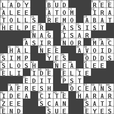 ACROSS 1. Kenny Rogers chart-topper in '80 5. Partially opened flower 8. To riddle 11. Toward shelter 12. Tiny particle 14. Lyricist Gershwin 15. For Whom the Bell _____ 17. San ____ (Riviera town) 18. Blind as ____ 19. Aide 21. Help 23. Tired old horse 25. Austrian river, tributary to the Danube 26. SW Saudi Arabia district 27. Or not 28. Big _ 31. Actor Linden 33. Born 35. Prevent from happening 37. Simple or foolish person 38. Affirmative reply 40. Likelihood 41. Splash clumsily 43. Teachers' org. 45. Area sheltered from the wind 46. Connecticut Ivy Leaguer 47. Binary compound 50. Writer Wiesel 52. Prepare for publication 53. Pacific Standard Time (abbr.) 54. Anew 56. Seas 61. The main thing one is thinking about 62. Quote 65. Ethiopian city, capital of Harari 66. Last letter of the English alphabet 67. Skim 68. Suttee (variant) 69. Conclusion 70. Take to court 71. Sight organs DOWN 1. Thin strip of wood or metal 2. _ vera 3. Small valley 4. Sharp bark 5. Soap unit 6. Shoshoni 7. Kingdom 8. Chest bones 9. Part of Q.E.F. 10. Ingest 13. With motion or animation 16. Elected reps. 18. Wind 20. Precipitation 22. "Two Mules for Sister ____" 24. Jennifer or Joel 26. High mountains 28. Method 29. Helper 30. Music discs 31. Land elevation 32. Mine, in Marseilles 34. Car or cant ending 36. Short-tailed, large-bodied rat 37. Compass dir. 39. Ooze 42. Flintstone garb 44. In addition 48. Flat circles 49. Value system 51. Hankering 52. Epoch 54. An important port of Yemen 55. Nourish 57. Comfort 58. Like ___ of sunshine 59. Nathan's nickname 60. Indian titles of respect 61. Ending with capital 63. The 19th letter of the Greek alphabet 64. Compass dir.